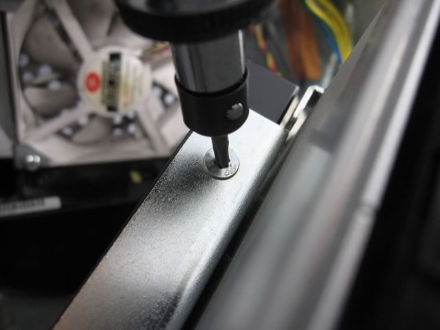 続いてドライブベイと本体の間に挟まっているシールドを外します。トルクスネジ(T10)で2ヵ所固定されているので,サイズに合うドライバを用意しませう。