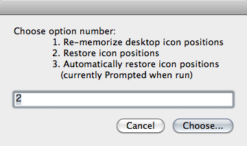 ちょっと古いソフトだけど,OS X 10.6でも問題なく使えるようです。ただし,私が試した限りではXCodeでコンパイルされているアプリ版(子供の写真が張り付いている方)ではイマイチ挙動があやしかったので,同梱されているAppleScript版を使っていますが(AppleScript DIM/DIM 2.0.app の方ね)。このソフトを立ち上げると右図のようなダイアログが表示されるので,初回時は「1」(Re-memorize desktop icon positions)と入力し,現在のデスクトップアイコンの配置を記憶させます。そして,何かの拍子にアイコンの並びがくるったら,もう一度“DIM 2.0.app”を立ち上げ,今度は「2」(Restore icon positions)を選択します。すると,一瞬で並びを復元できるので,デスクトップに大量のアイコンを置いているケースだと,再配置の手間を大幅に省けると思いますよ〜。問題は,デスクトップに置くファイルが頻繁に変わる場合はしょっちゅうこのソフトを立ち上げて,アイコンの配置を再記憶させないといけないことだけどね。