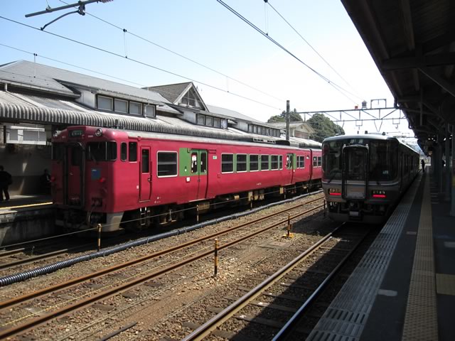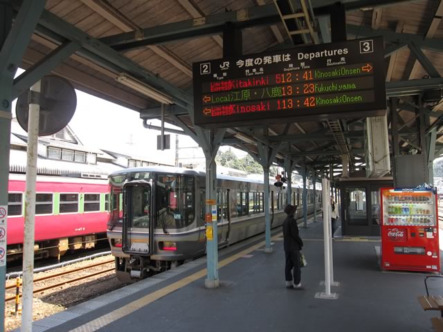 豊岡駅で普通列車に乗り換え。最新の223系とキハ47系のコントラストが何とも。