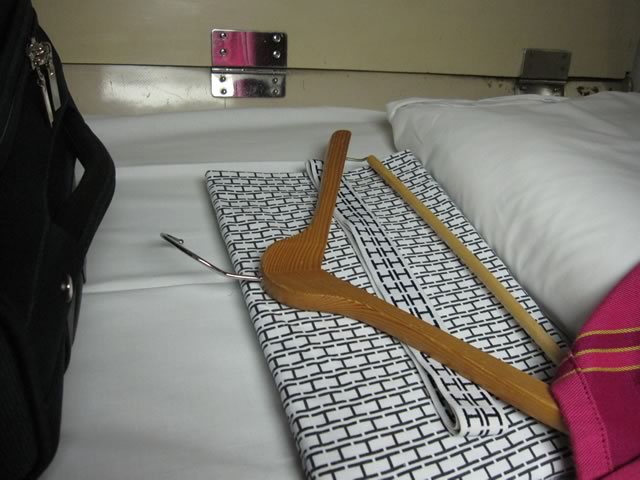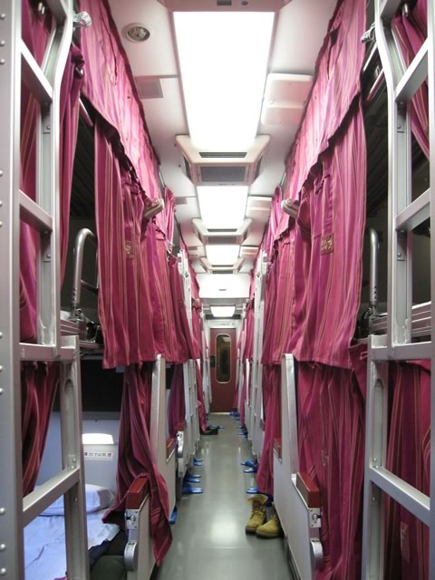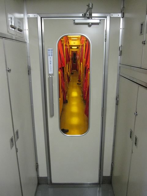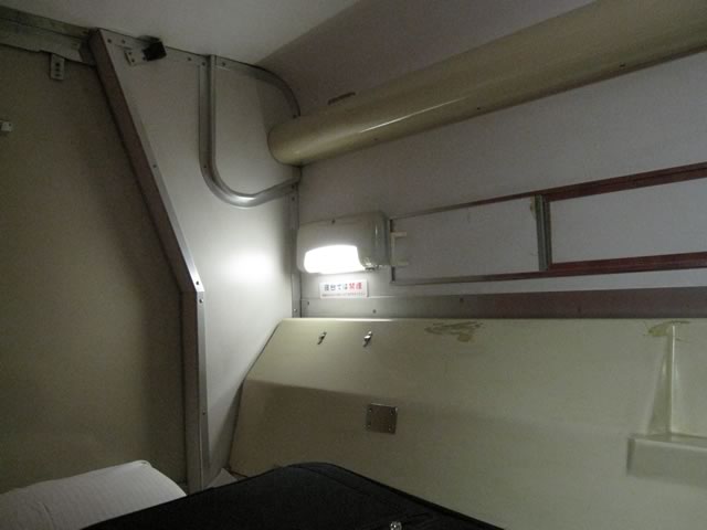 グリーン車からB寝台へと車内を歩いて移動。パンタグラフ直下の寝台席は三段ベッドの中段扱いにも関わらずスペースの関係で実際には二段しかなく,頭上が広々としています(なので乗り特!)。