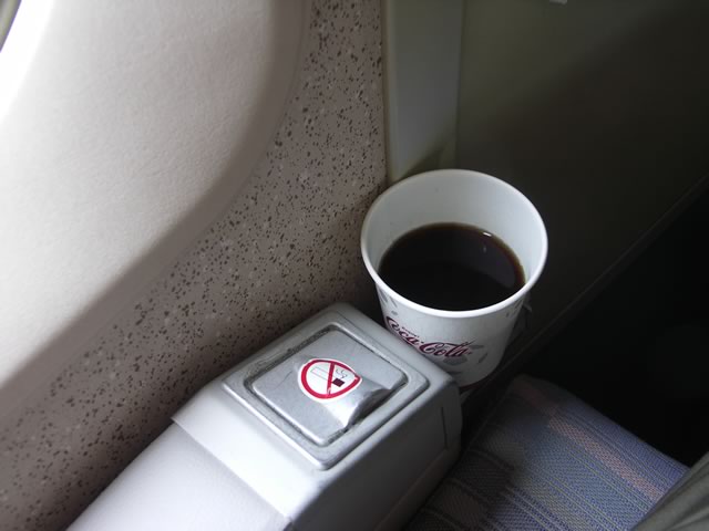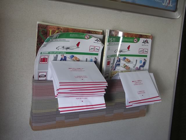 相変わらず大量に積んであるエチケット袋と,珍しくドリンクサービスがあったので撮ってみた一枚。