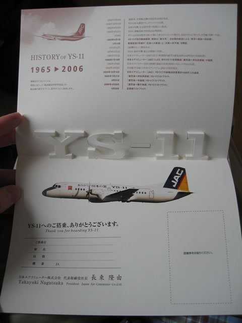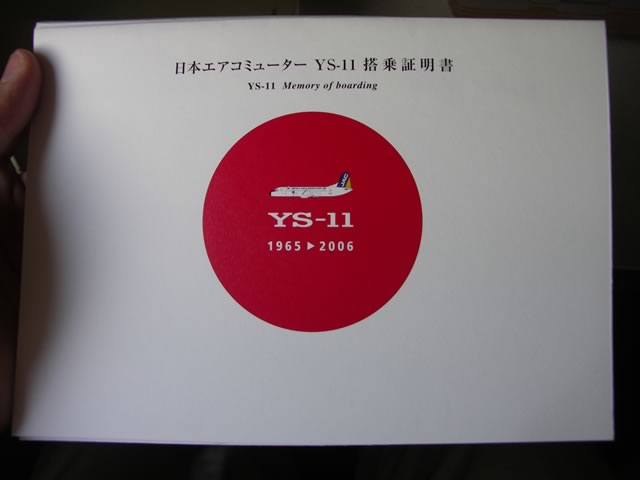 “特別版”搭乗証明書。でも,いつ・どの路線に乗ったかはジブンで書いてねー,ということみたい(スタンプでもいいので日付を押してくれていたらなぁ^ ^;)。あっちなみに,5月11日に乗った人には特製YS扇子も配られたようですが,6月はザンネンながらなかったです。