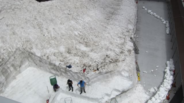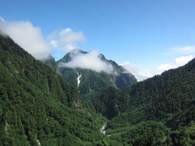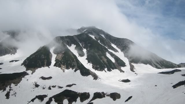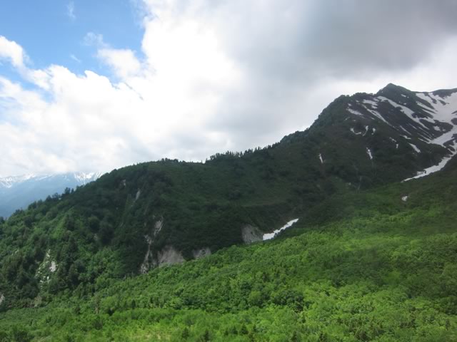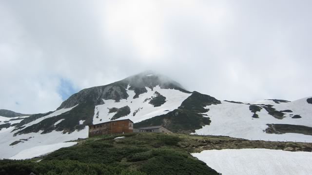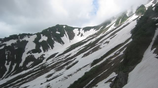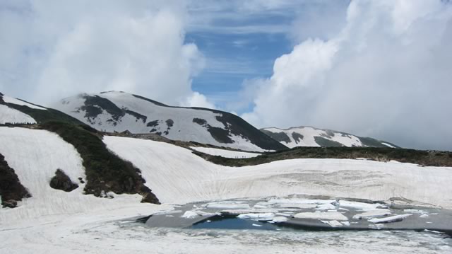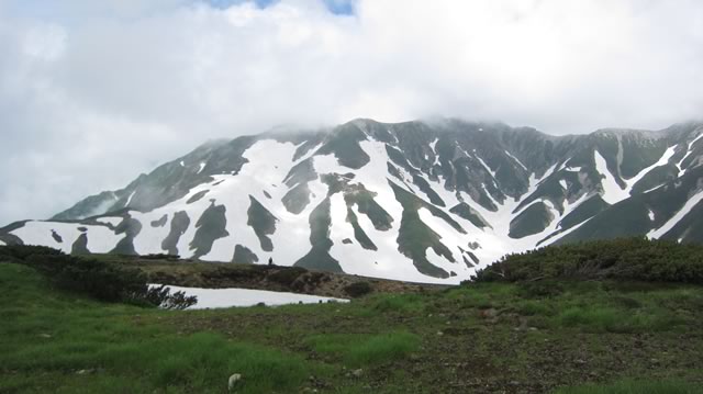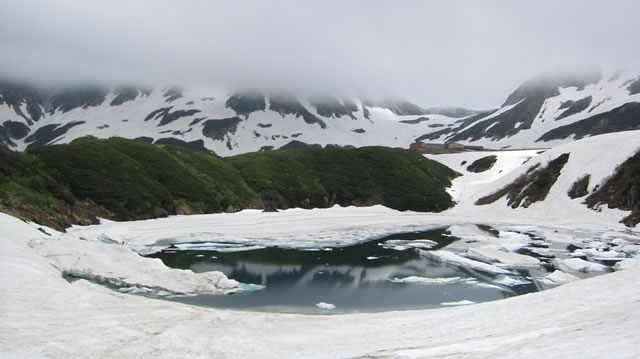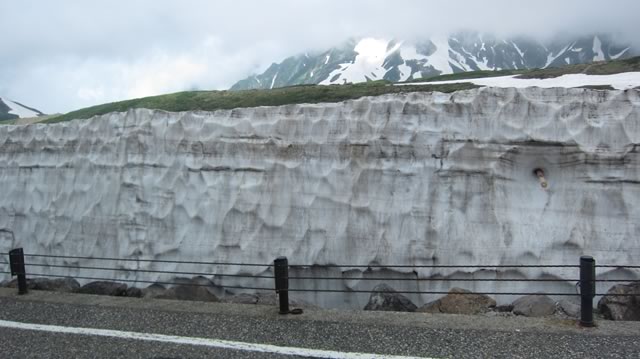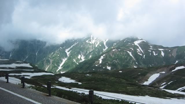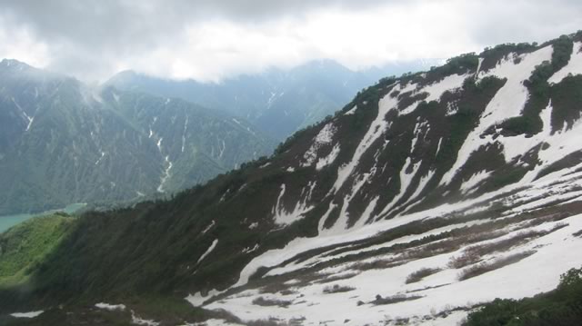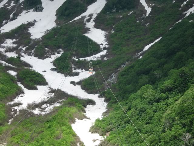 このあたりになると所々に万年雪が。大観峰駅から黒部平駅を見やる。