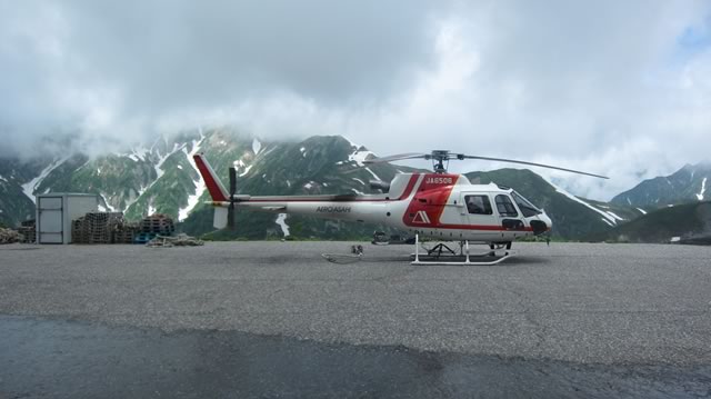 山小屋へ荷物を運搬するヘリコプター。車のようにこんな道の端に停めるとは。