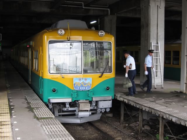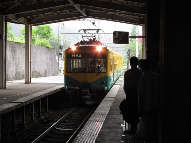 立山駅着。ここからは富山地方鉄道(地鉄)のアルペン特急で宇奈月温泉へ。でも,1日1本か走っていない直通特急って…。おまけに特急料金を取るのにやって来たのは普通列車と同じ車両。