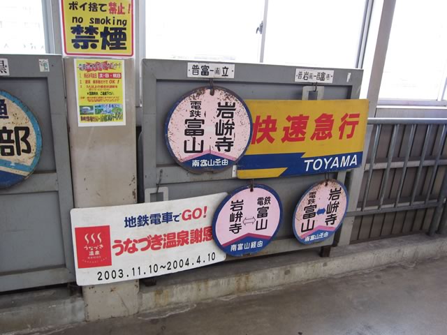 電鉄富山駅到着。ヘッドマークがこれでもかというぐらい吊されていますねー。