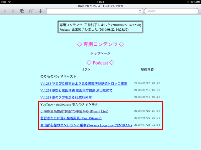 なお,上記の仕組みを使うには,RSS Handler アプリケーションを常時立ち上げておく必要があるため,PCがシャットダウンしているとYouTubeの動画がダウンロードされないのでご注意を。また,タイミングによってはポータブルWi-Fiにファイルが落ちてこない(コンテンツページに表示されない)こともあるみたいなので,うまくいったらOKぐらいの気持ちで使ってみてくださいな(笑)。