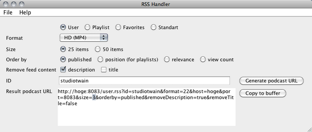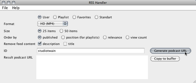 5. 設定ウインドウのトップで「User」を選択している場合は,講読したいYouTubeユーザーのIDを入力します(例:studiotwain)そして『Generate podcast URL』ボタンをクリックすると,Result podcast URL欄にURLが生成されるハズです