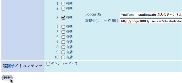 ポータブルWi-Fiには,3G/有線LAN/無線LANを回線状況に応じてシームレスに切り替える機能や本体に装着したmicroSDにデータを保存し簡易NASとして使う機能などデジタルガジェット好きとしてはなかなか遊び甲斐があるのだけど(笑),指定したサイトをオフラインでも閲覧可能にする「巡回サイトコンテンツ」「Podcastコンテンツ」自動ダウンロード機能なんてのもあったり。これってアナログ回線の時代に流行ったWWWオートパイロットじゃない〜(懐かしい^ ^)と思いつついろいろ触ってみたもののネットつなぎ放題のご時世,イマイチ有効活用する術が思いつかないのですよ。そんでもって,アレコレ考えてみたところ,YouTubeの人気動画を毎朝自動でダウンロードし,通勤(通学)列車の中でさっと見る(いわゆる「見て消し」)のに使えないかな,との結論に達しちょっと調べてみました。YouTubeの動画は多くがFLVベースで標準ではファイルとしてローカルディスクに落とす機能は提供されていないので,マッシュアップしているよーなサービスがないかとチェックしてみたところ…なーんだあるじゃないか〜。RSSHandlerというサイトのサービスを利用すると,YouTubeのチャンネルのURLを指定するだけでMP4形式のダウンロードURLを含むRSSを書き出してくれるので,これ(=URL)をポータブルWi-Fiの管理ページ>コンテンツ>Podcastコンテンツ のURL欄に貼り付ければ,あとはよしなにやってくれるのでは考えたものの…あれ,うまくいかない。どーやらYouTubeが最近仕様を変更し,同一IPからのダウンロードの大量リクエストを受け付けなくなったのが原因らしい(ソース)。そんなわけで,一見楽勝そうにみえたものの,仕様変更の壁に阻まれてお手上げかと思いきや,RSSHandlerのサイトをよく見てみると,代わりにスタンドアロン版のソフトが提供されていますねー。さっそくこちらも試したところ…おぉうまくいった。というわけで,ポータブルWi-Fi からYouTubeの動画を自動ダウンロードするための手順を備忘録がてら以下にまとめておきます。