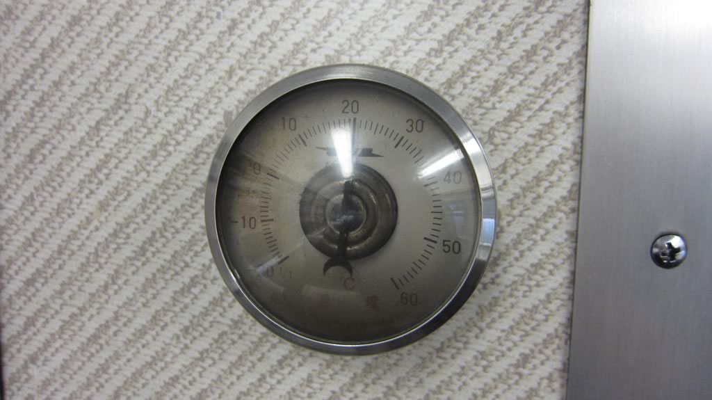 洗面所と室内温度計。よく見ると温度計の中にJNRのマークが。