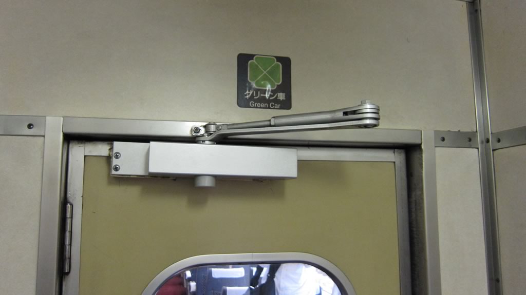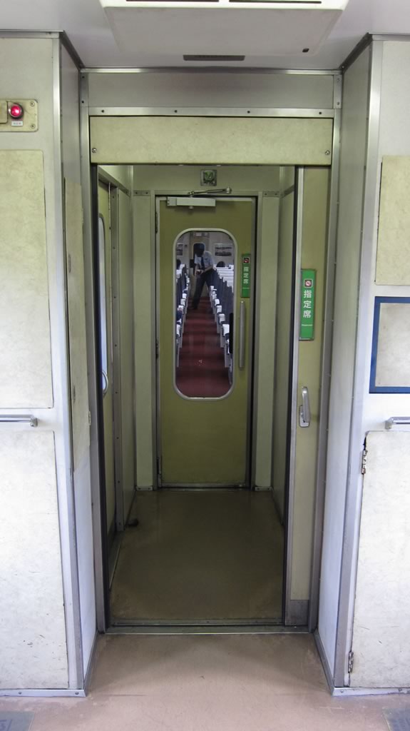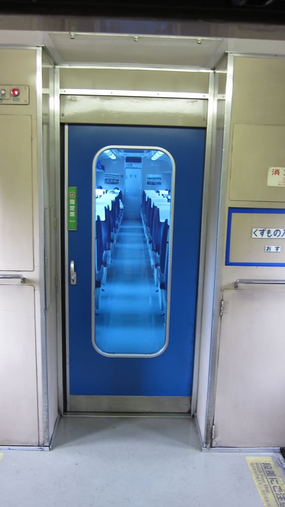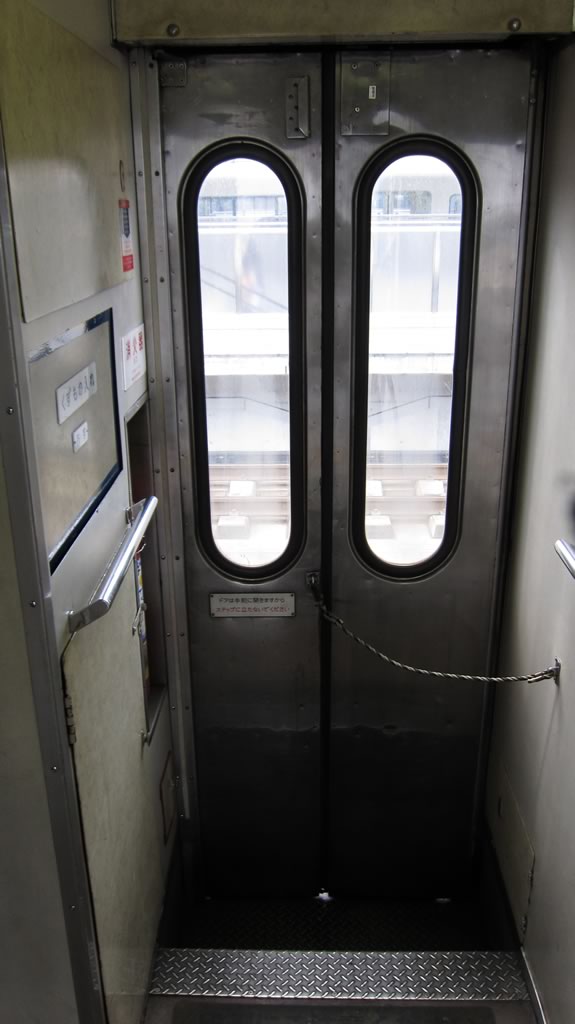 レールバスを除くと今や珍しい折り戸の扉と,こちらも特急用車両としてレアな手動のデッキ扉。時代を感じますな。