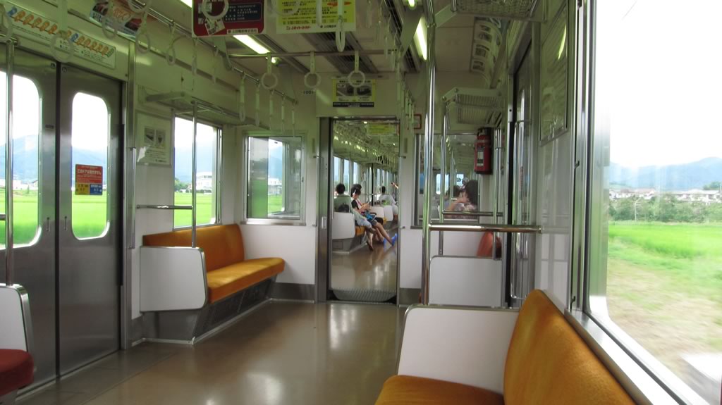 開業時に走っていた丸窓電車を再現した列車との行きちがい。のどかな田園風景が続きます。