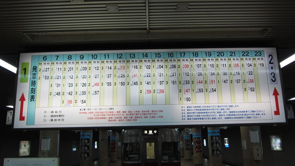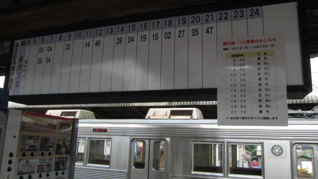 須坂駅で屋代線に乗り換えようと思ったら…調べていたダイヤの列車がない! どうも7月中は(屋代線利用促進のために)増便試験を行っていたようだけど,8月以降は通常に戻ってしまったよーで。代わりに屋代線と同じ区間を走るバスが増便されていたけど,それじゃ乗りつぶしにならないからね。