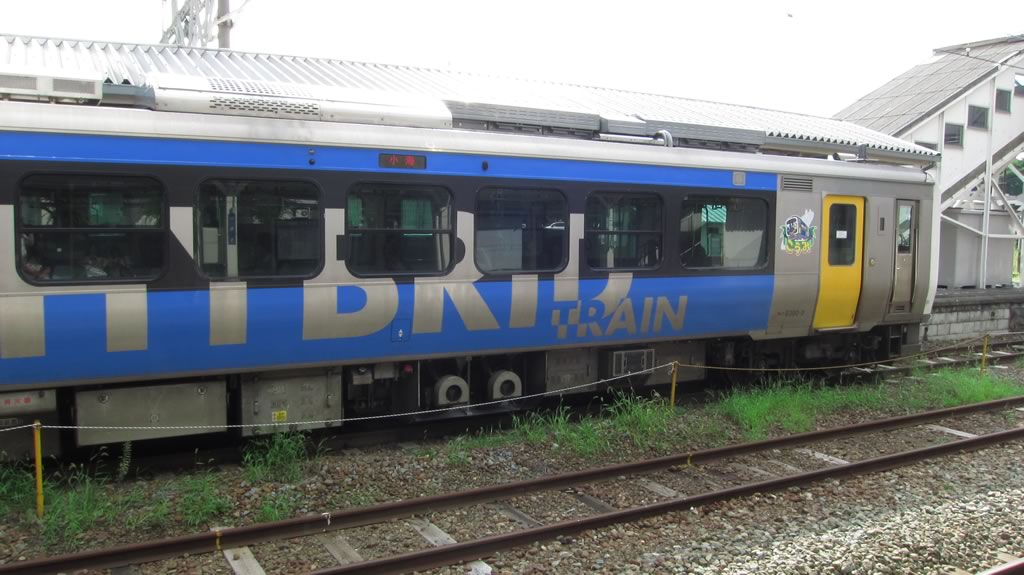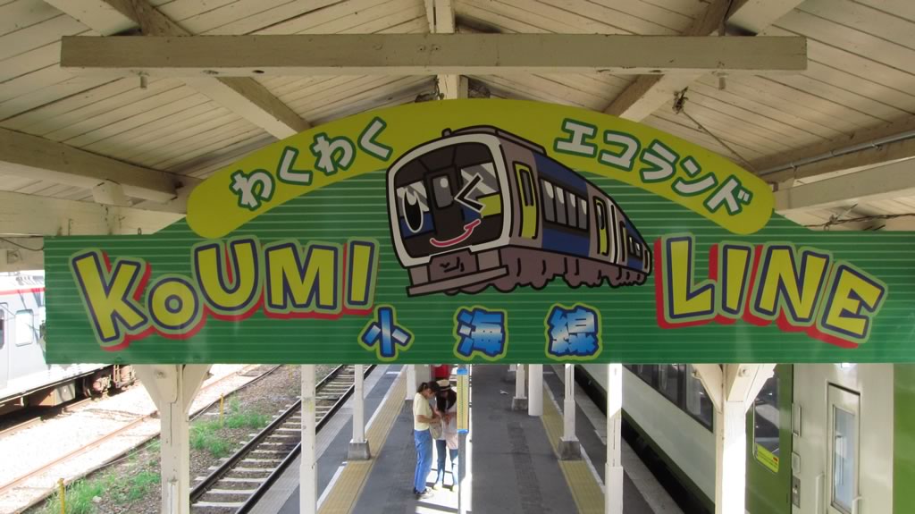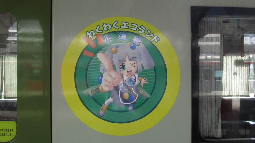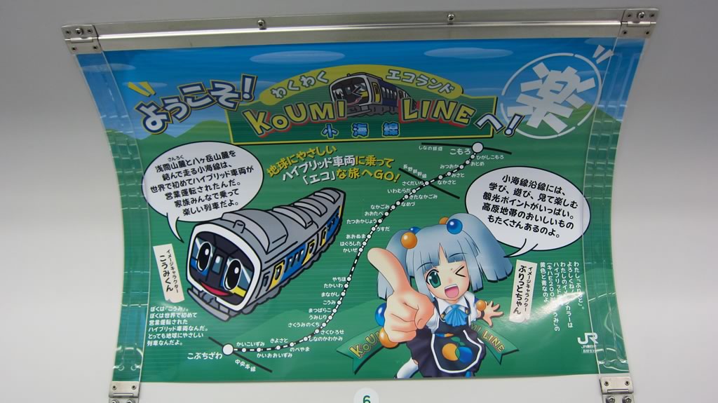 停車中の列車に描かれているのは,小海線の萌えキャラクターこと,こうみくん&ぶりっとちゃんだそーで。