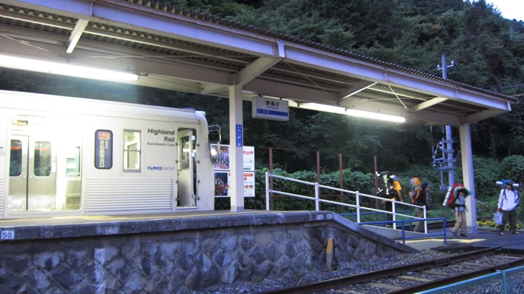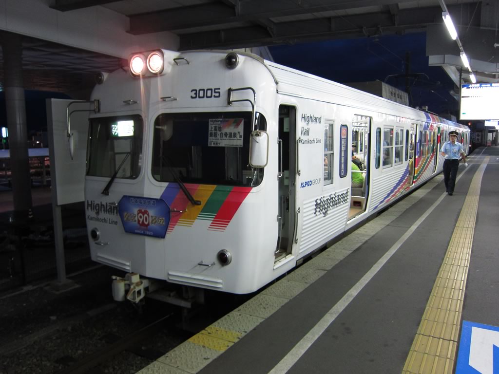 松本電鉄上高地線の始発電車に乗車。なんと,始発は朝4時45分(どうやらムーンライト信州運転日のみ走っている模様)。こんなに朝早くだから乗客もいないだろうとタカを括っていたら大間違い。登山客で車内はギッシリでした。ちなみに,この列車は終点新島々までノンストップで走ります。