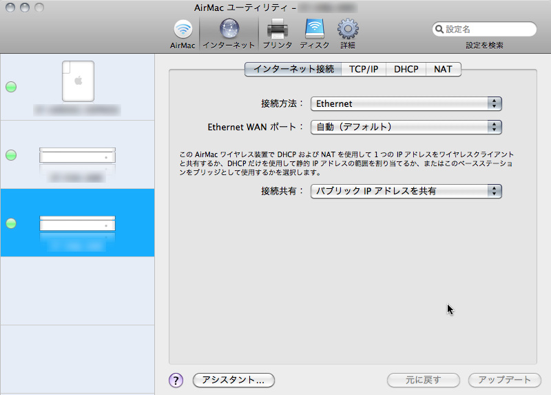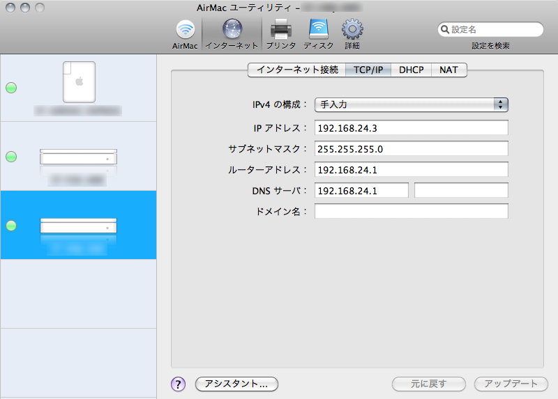 3. 続いてAirMac ユーティリティ.app(/アプリケーション/ユーティリティ)を立ち上げ,設定を行うベースステーションを選択し,『手動設定』ボタンをクリックします。さらにインターネット>インターネット接続> を開き,以下の設定を行います。