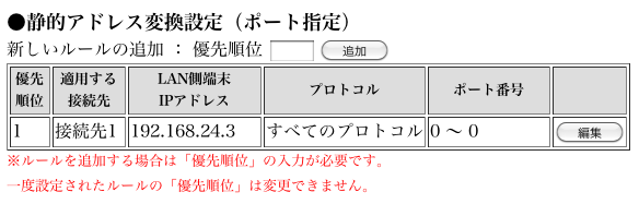 2. 同じくCTU設定ページのTOP>詳細設定>静的アドレス変換設定(ポート指定)から,ポートマッピング設定を行います。下図を参考に,1.で払い出しの指定を行ったベースステーションの(WAN側)IPアドレスに,すべてのプロトコルとすべてのボート番号(0〜0)を転送するよう設定します。