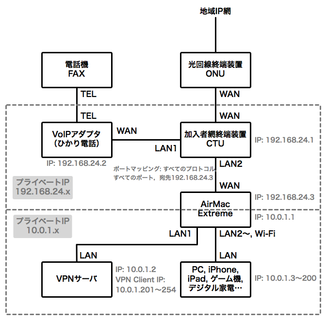 ただ,フレッツ光でインターネットに接続する場合,通常CTUと呼ばれる装置がルータ機能を担うため,ベースステーションはブリッジ接続(スイッチングハブ的な使い方)になってしまい,VPN接続に必要なネットワーク設定ができないのデス。そのため,CTUの設定画面からPPPoE機能を有効化し,ベースステーション本体からPPPoE接続するように設定を変えてみたのですが,私の環境だとどうやってもうまく動かないのですねー。また,ひかり電話も使っているので,CTUのルータ機能(というかDHCPサーバ機能)を切るのもマズかろうということで,こちらのサイトの情報を参考に,CTUで受けた(ひかり電話以外の)すべてのパケットをLAN側のベースステーションに転送するようにCTUの設定を変えてみました。VPNサーバを含むLAN側のマシンはベースステーションのLANポートに接続することになるため,見かけ上多段NAT構成になるのですが,とりあえず目をつぶることにします(^ ^;)。文章だけだと分かりにくいので,環境構築後の機器の配置図をチャートに書いてみました。ざっとこんな感じ。