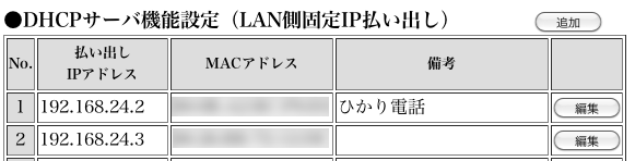 1. CTUがベースステーションに割り当てる IPアドレスを固定化するため,WebブラウザからCTU設定ページを開き,TOP>詳細設定>DHCPサーバ機能設定(LAN側固定IP払い出し)から,ベースステーションのMACアドレスと固定割り当てしたいIPアドレスを指定します(本例では192.168.24.3に払い出している)。ベースステーションのMACアドレスは,本体の裏蓋を見るか,AirMac ユーティリティ.app>AirMac>概要>Ethernet IDを確認してくださいな。