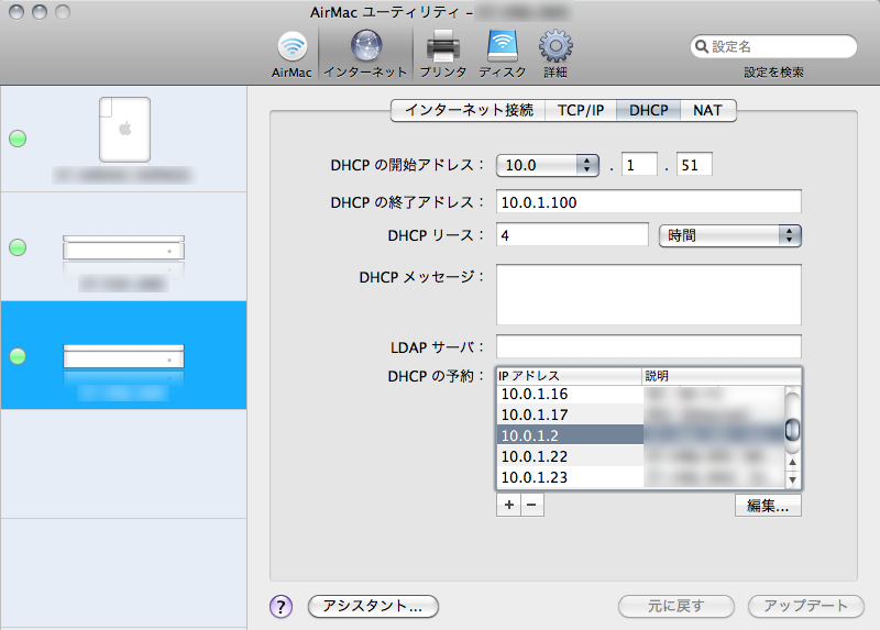 8. LAN側のマシンからインターネットに繋がらない場合は,システム環境設定>ネットワーク を開き,Ethernet(またはAirMac)>詳細>TCP/IP から『DHCP リースを更新』ボタンをクリックし,IPアドレスの割当をクリアします。また,DNSサーバのIPアドレスが“10.0.1.1”(ベースステーションのLAN側のIPアドレス)になっていることもチェックしてください。