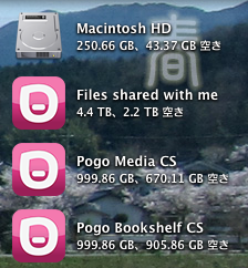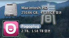 んでもって,ハードウェアのセットアップ後,専用Webサイトで配布しているドライバを入れるとローカルディスクと同じくデスクトップにマウントします(Macの場合。Windowsの場合は,マイコンピューターの中にドライブレターが振られたディスクが表示される)。またシステム環境設定>Pogoplug>Drive>Show a separate drive〜 のチェックをONにすることで,Pogoplugに接続しているボリュームを個別に表示することも可能。