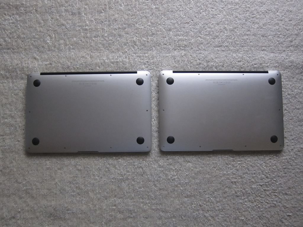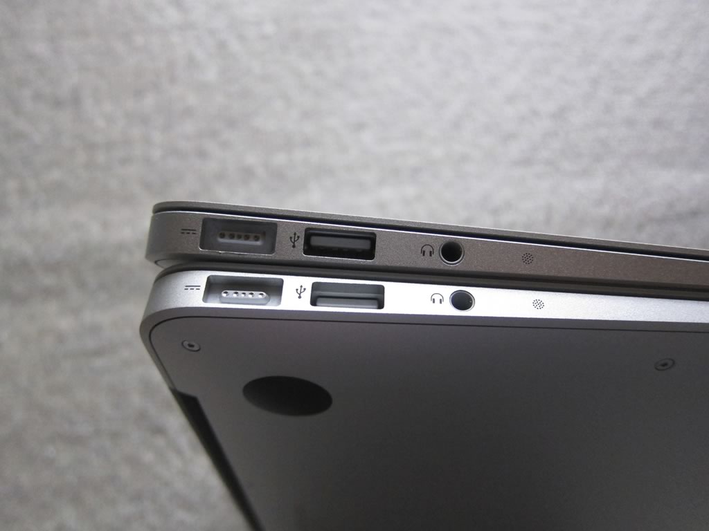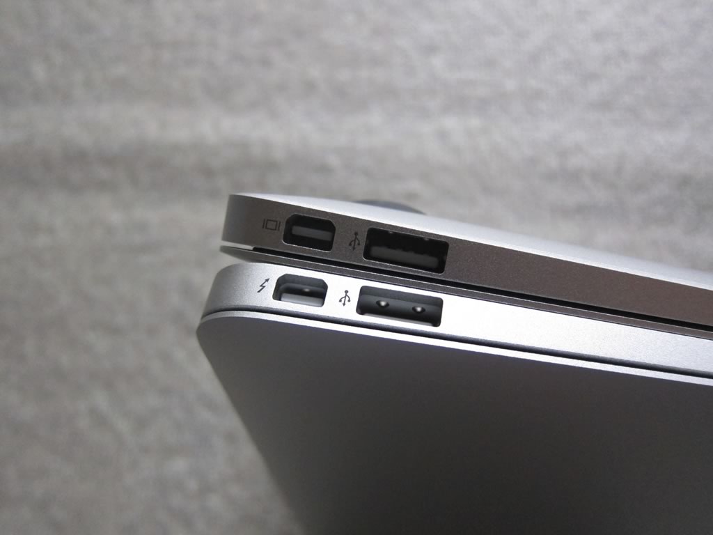 ハードウェアでキーボード以外に変わった部分といえば,本体右側のDisplayPortがThuderboltポートに置き換わったことぐらいでしょうね。とはいえThuderboltは対応製品がまだほとんど出ていないので実力と真価が問われるのは今後でしょうな。個人的には,外付けの高速SSDストレージが欲しいっす(下側:新モデル/上側:旧モデル)。