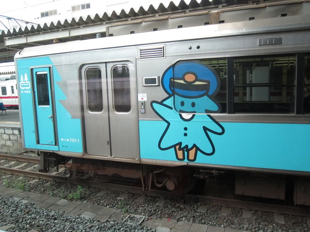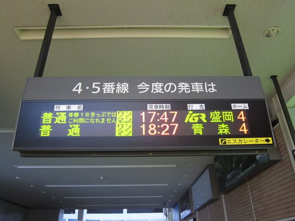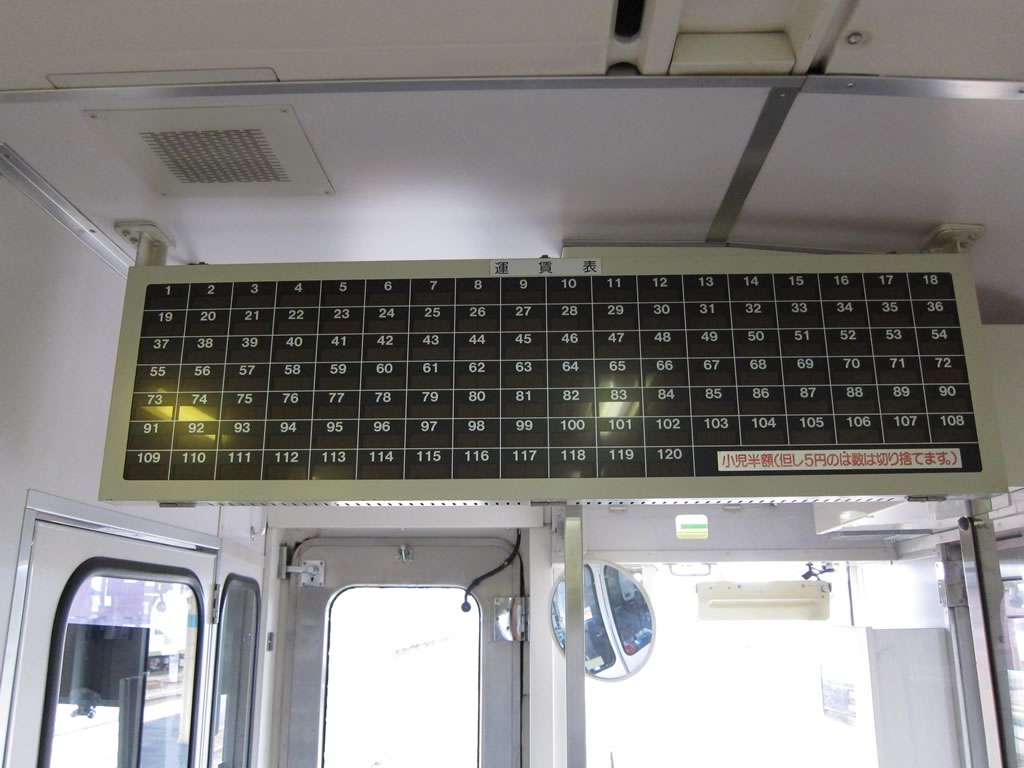大館からは弘前乗り換えで新青森まで奥羽本線普通列車に乗車。ワンマン列車には巨大な運賃表が(120番まである)。弘前駅には弘南鉄道の電車も停車中(こちらは前回乗車済)。