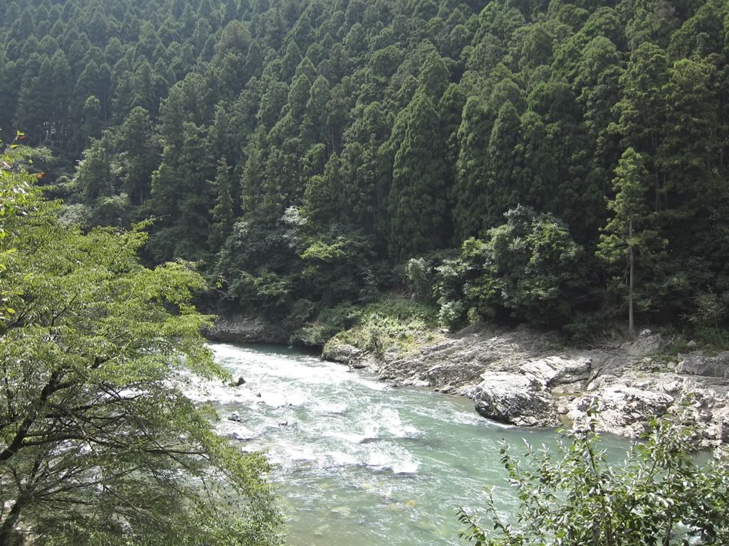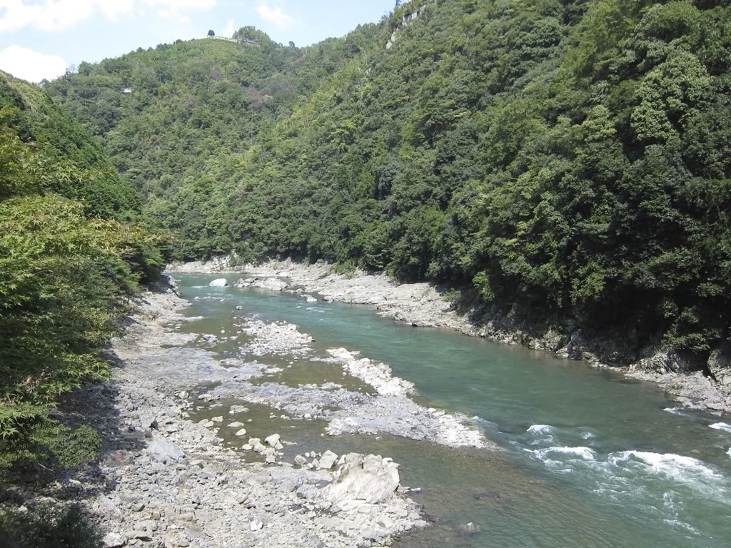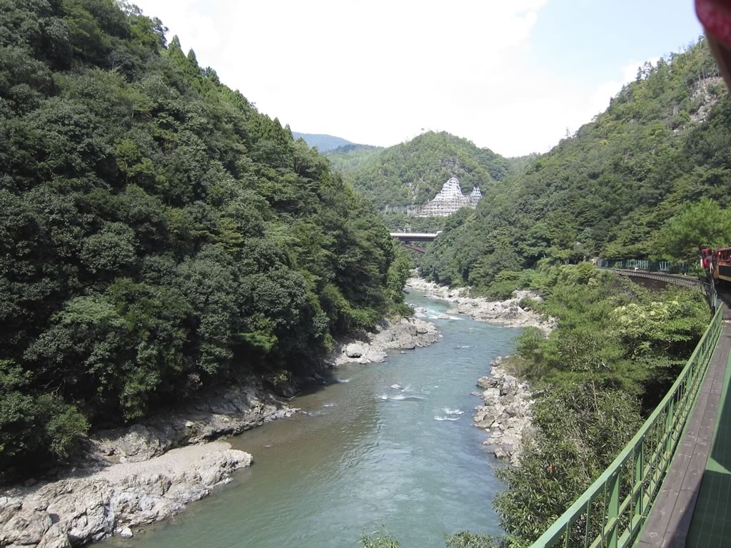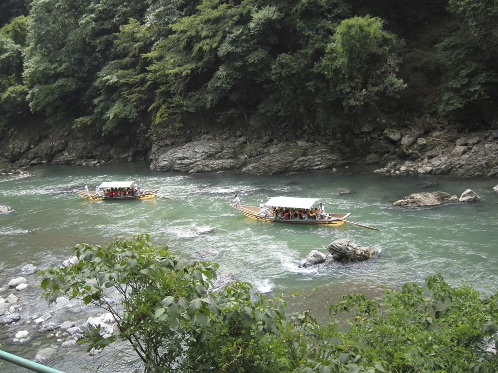 保津川下りの川船と遭遇。車窓から10艘近く見つけました。