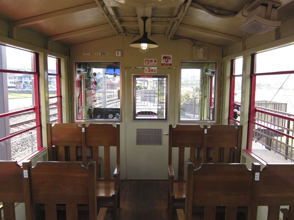 運転台と車内の様子。機関車は付け替えないので,亀岡方面の下り列車は推進運転になります。