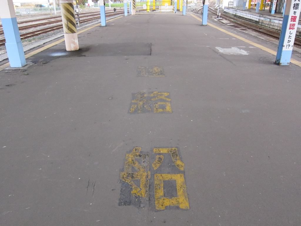 よく見るとホームにはかつて連絡船へ誘導するのに使われた案内表示の跡が。