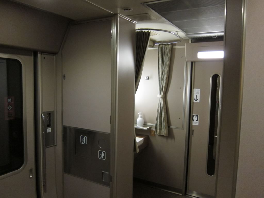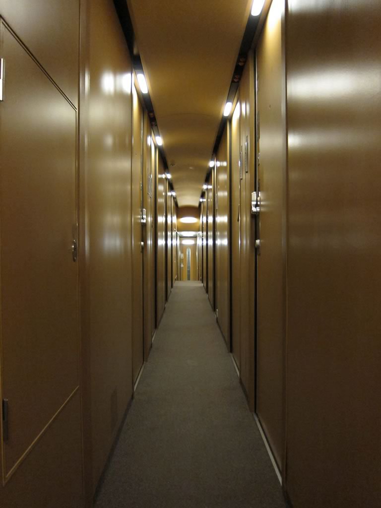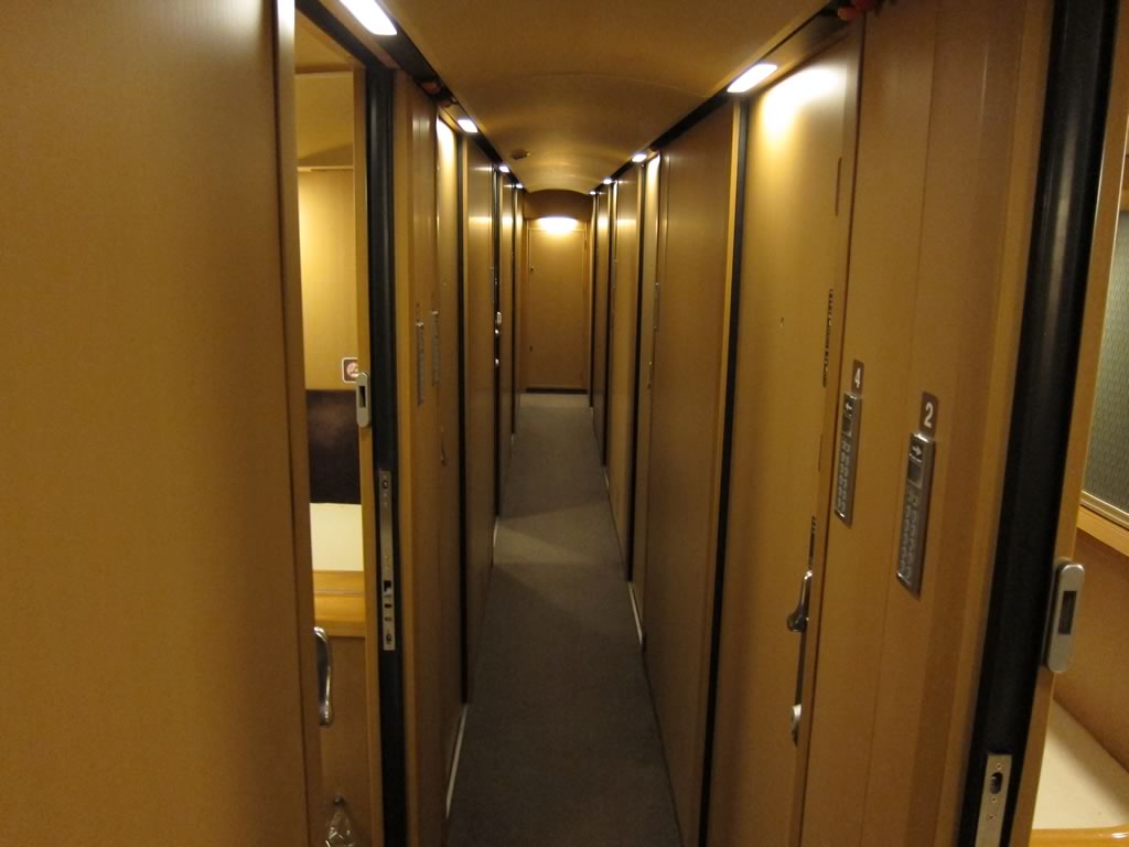 9号車のB寝台シングル個室へ。サンライズ号の寝台はすべて個室になっており,どのスペースも鍵をかけることができます。