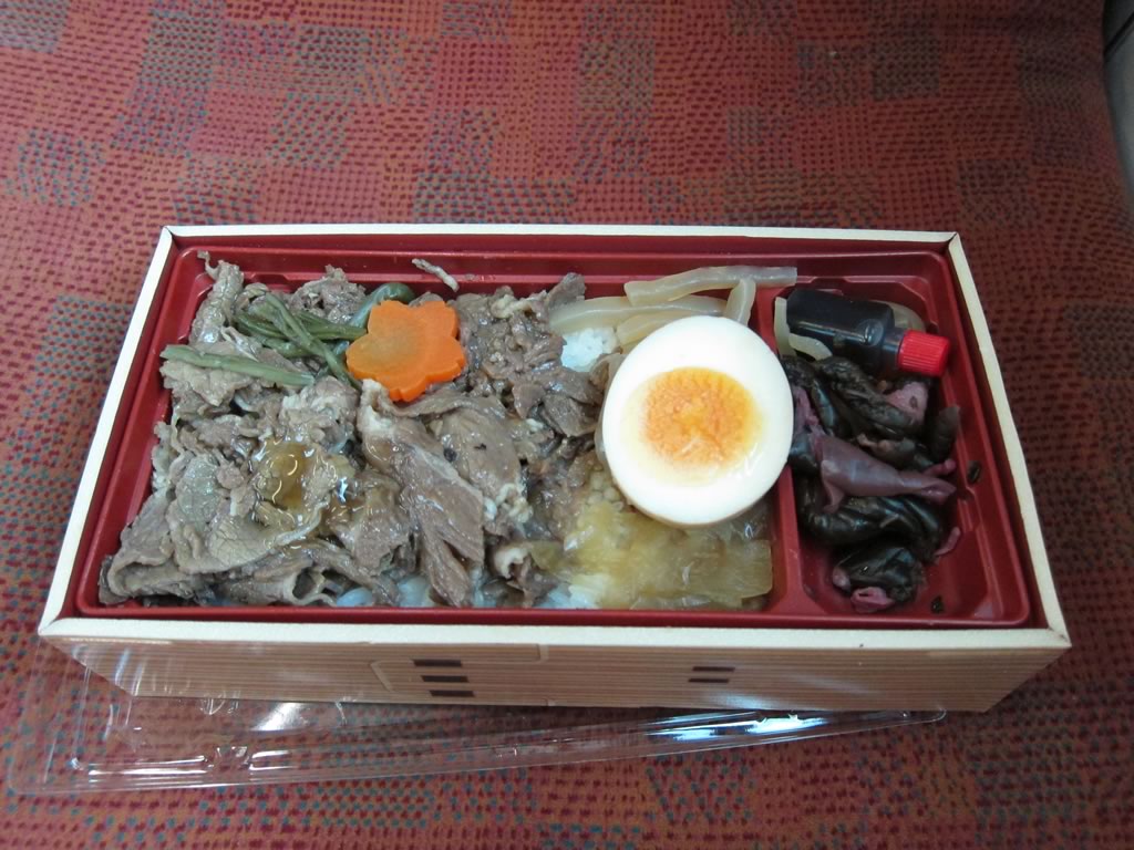 車内で水戸駅で購入した駅弁を食べる(美味)。牛めし系の駅弁はハズレがないね。
