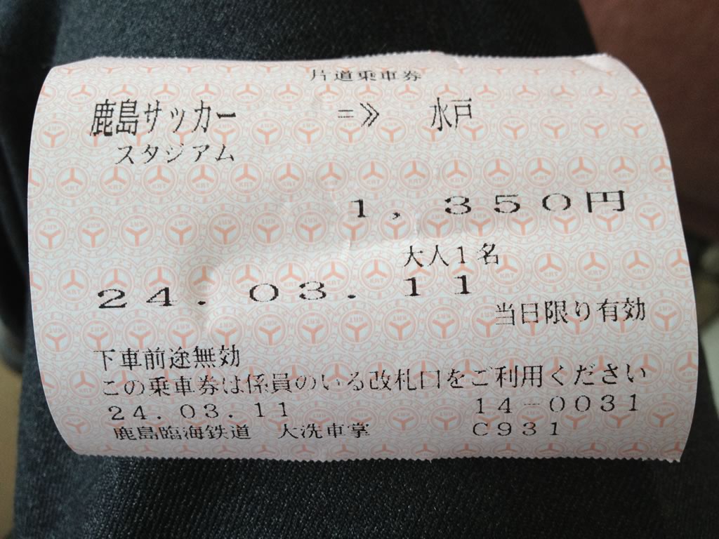 鹿島臨海鉄道はJR線ではないので車内で運賃精算。路線的には鹿島サッカースタジアムからになるのだけど,臨時駅なので普段は停車しないのですね。だけど,きっぷ上はこのように打ち出されます。