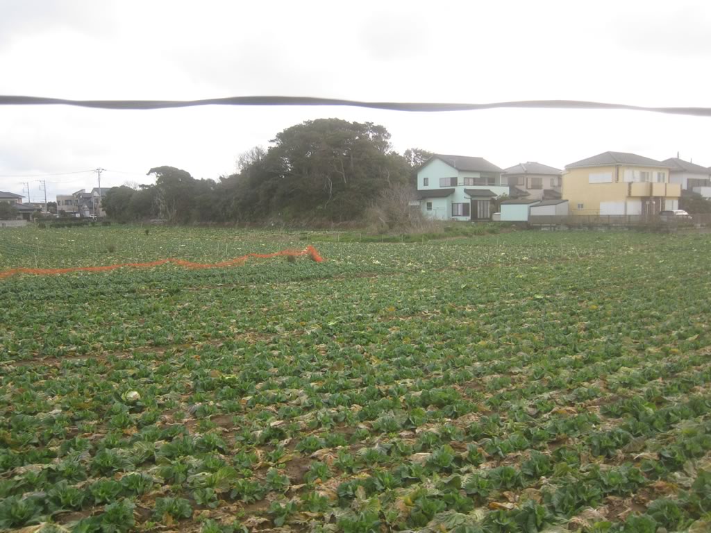 朝日を受けながらキャベツ畑のなかを進む。
