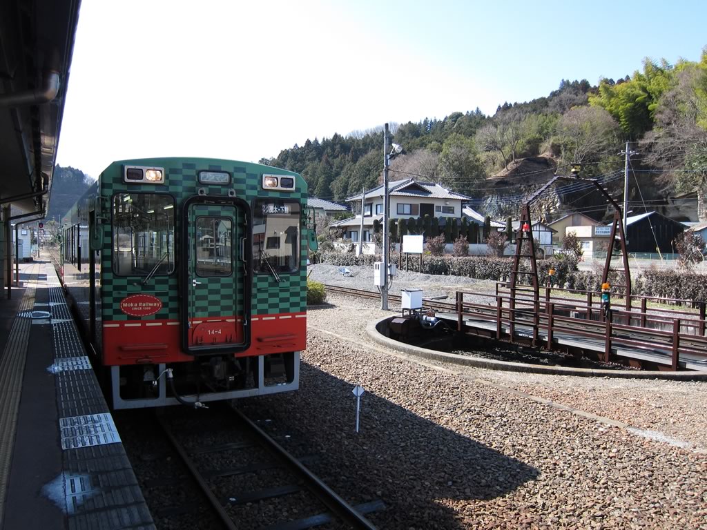 終点茂木駅。蒸気機関車用の転車台(ターンテーブル)が見えますね。