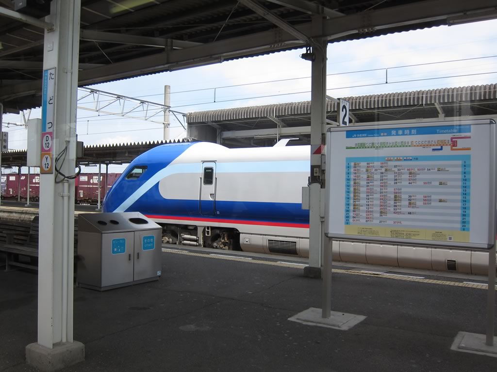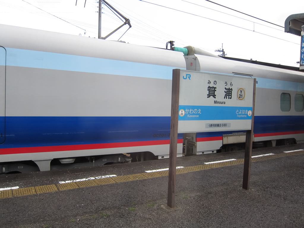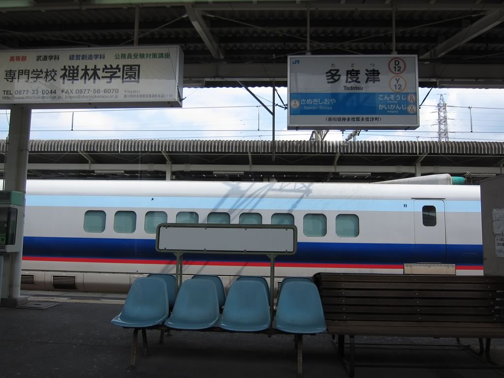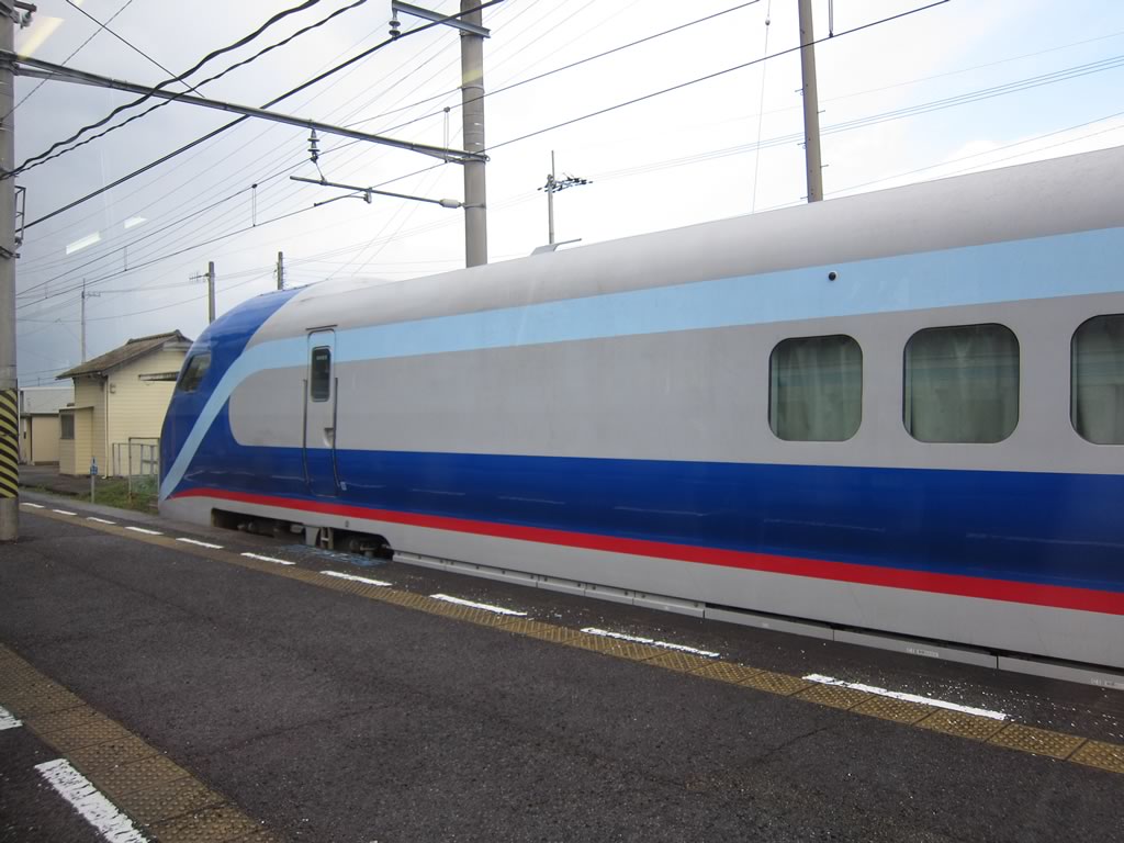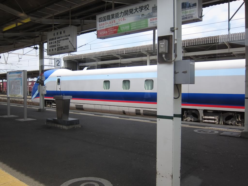 予讃線を試験走行中のフリーゲージトレイン。行きと帰りで2回も目撃してしまった(^ ^)。停車中の車両を見るとほとんど新幹線ですな。