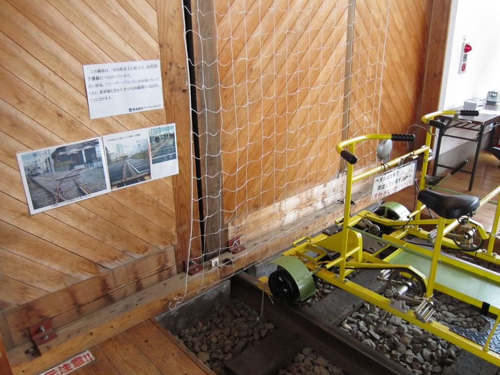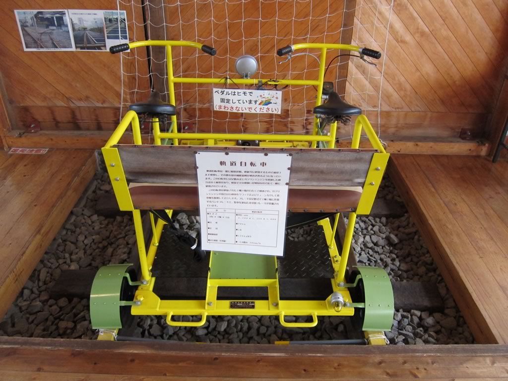 保線等で使われる足こぎ式の軌道自転車。レールは伊予西条駅構内につながっているとのこと。