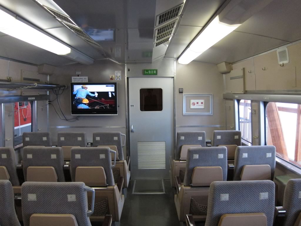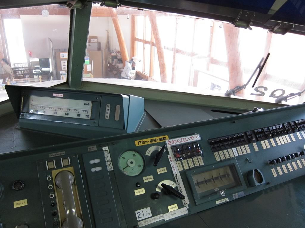 続いて0系新幹線の車内へ。1両丸ごとではなく,途中でカットされています。ちなみに反対側の運転台はイギリスのヨーク国立鉄道博物館に渡ったのだとか。