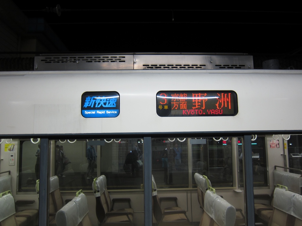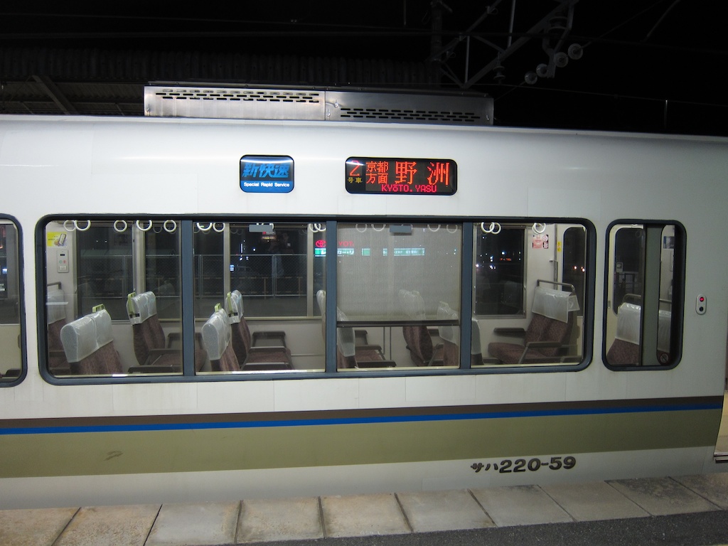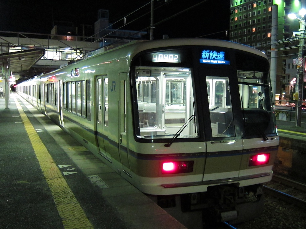 今年で全通50周年の某路線が分岐する某新幹線停車駅(って,どこだか分かるよね^ ^;)の在来線ホームで列車を待っていると,いつもは223系か225系が走っている時間帯に221系がやって来たではないか。で,よく見ると種別が新快速になっている! おぉ,イベント以外で221系新快速を見かけたのはひっさしぶりだったので,思わずカメラに撮ってしまいました。どうやら,今日はダイヤが乱れていたらしく,車両繰りが付かなかったためか,221系が激レア仕様でやったきたよーです。とはいえ,行先は「京都方面野洲」行になっていたものの,姫路で運転打ち切り→隣のホームに停車している225系新快速へ乗り換えるように誘導されたケドね(221系は130km運転が出来ないので,そのまま姫路以東を新快速として走ったら運行上支障があったのでしょう)。