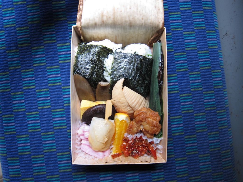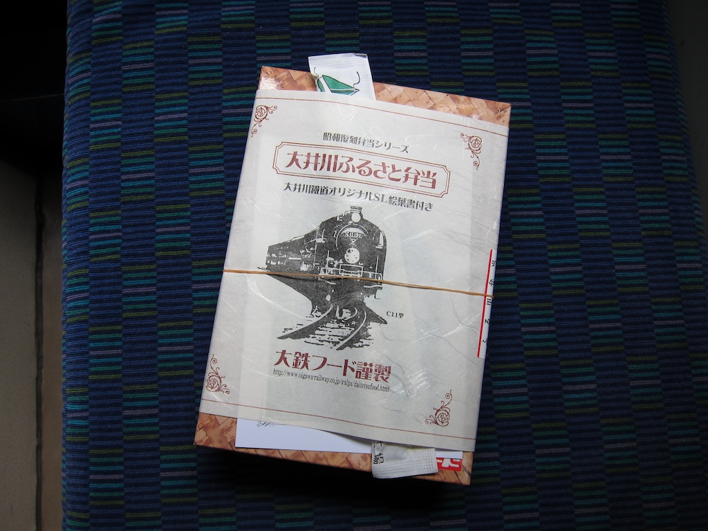 金谷駅で買った大井川ふるさと弁当。ヤマメの甘露煮も入っていて,見かけ以上にズッシリとしています。
