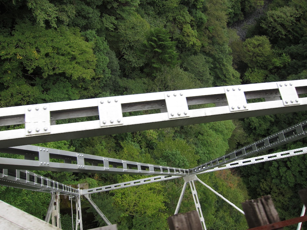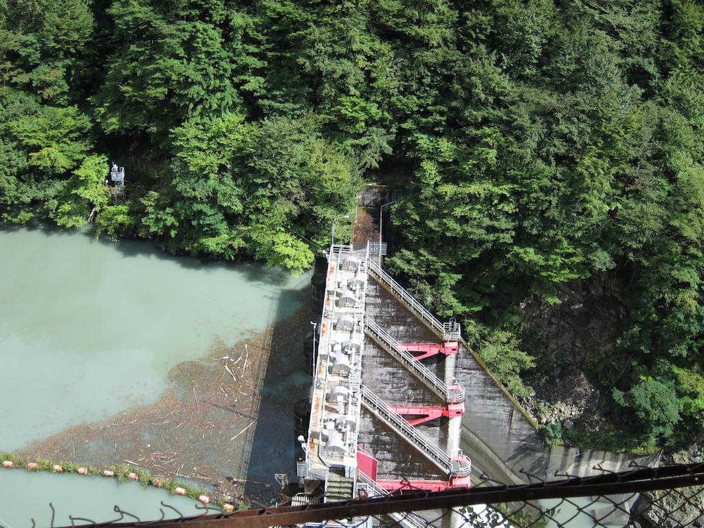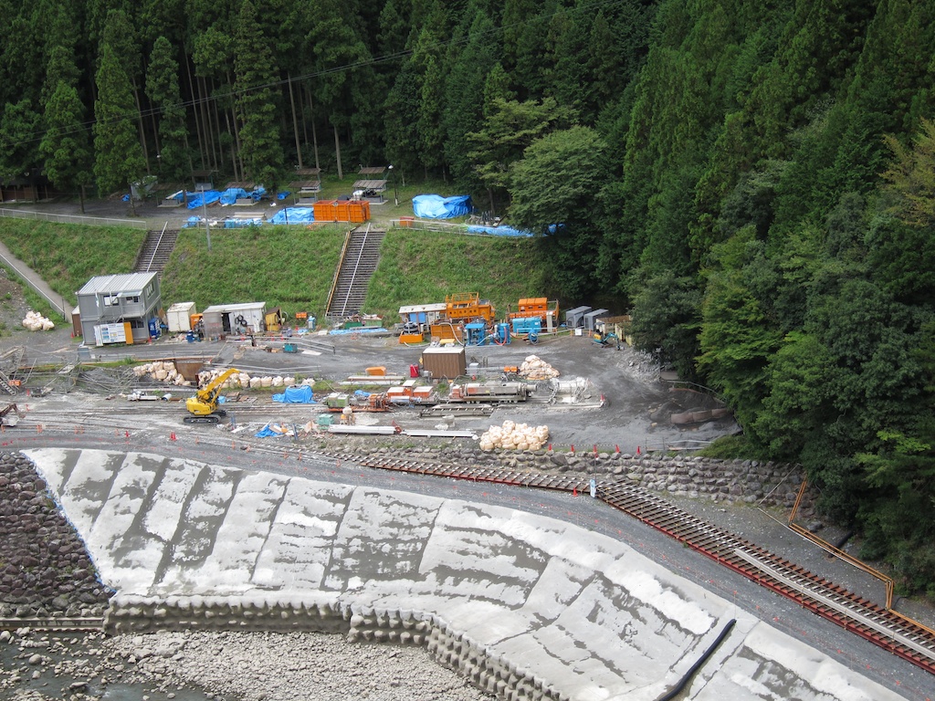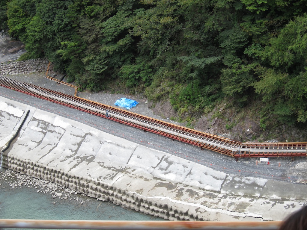 遙か下では,大井川の清水化バイパスのトンネル工事を行っている模様。トロッコで土砂を運び出すための線路が引かれています。