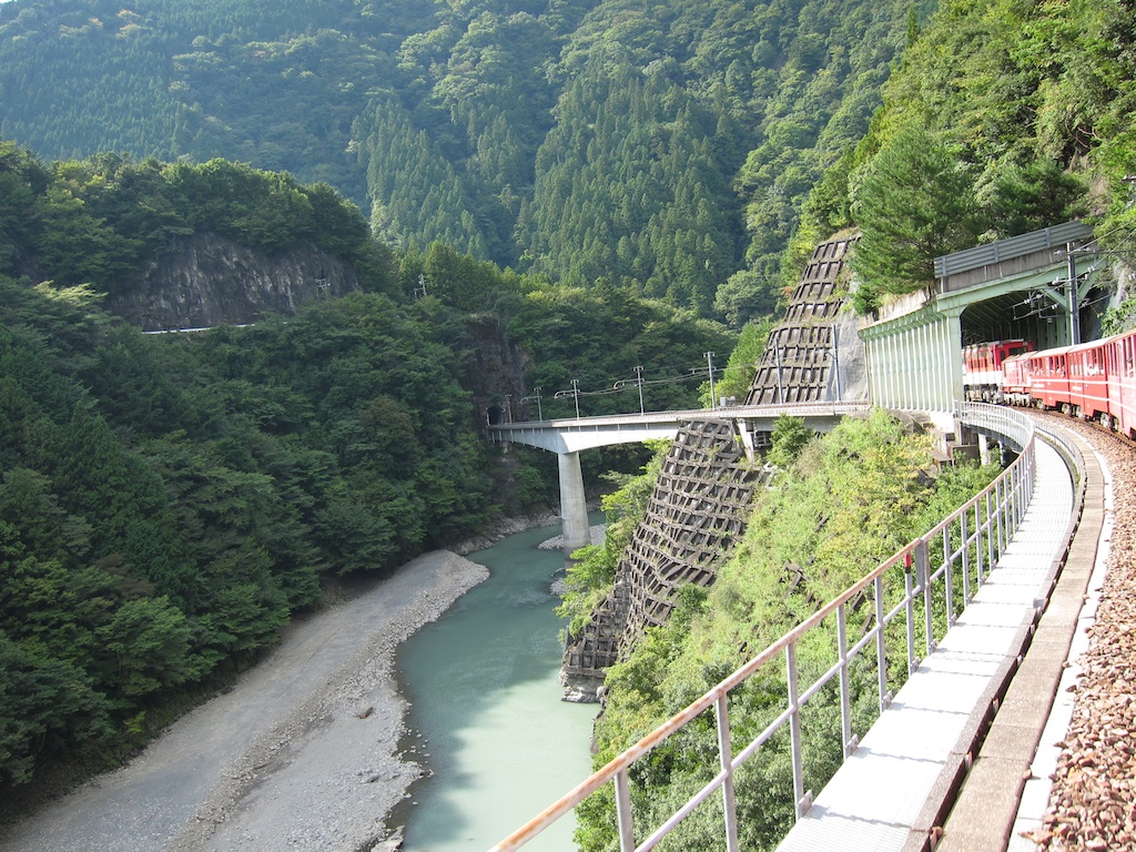 奥大井湖上駅周辺。鉄橋の横は遊歩道になっており,駅で降りて歩くこともできます。