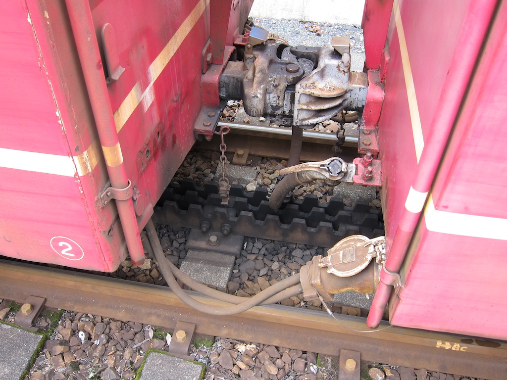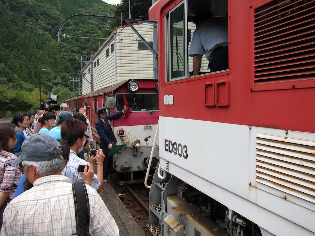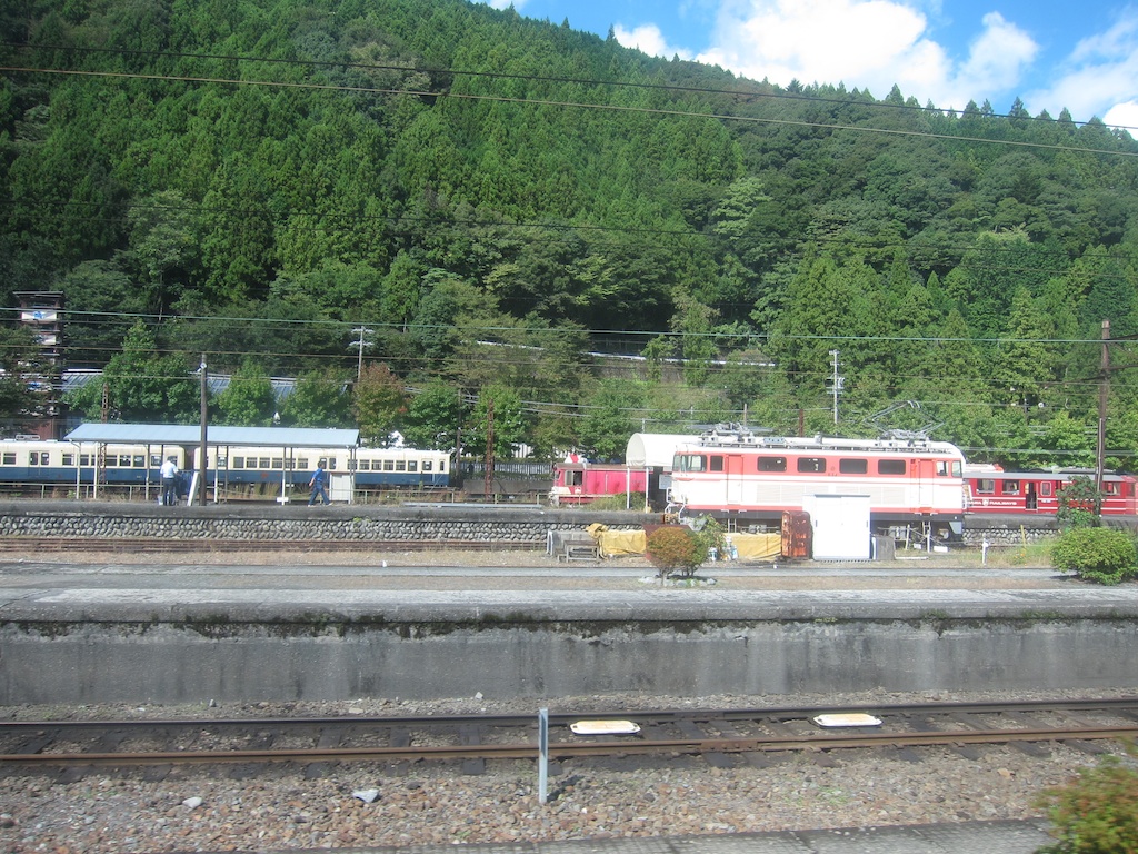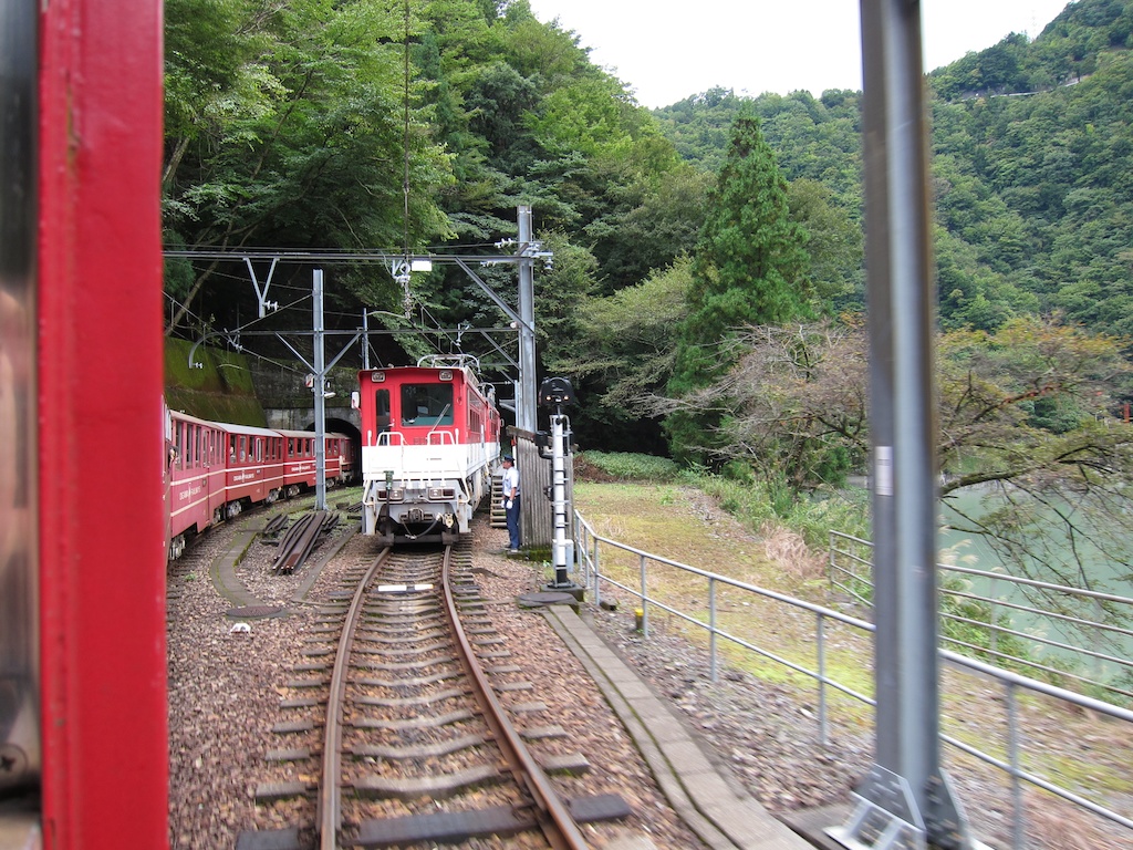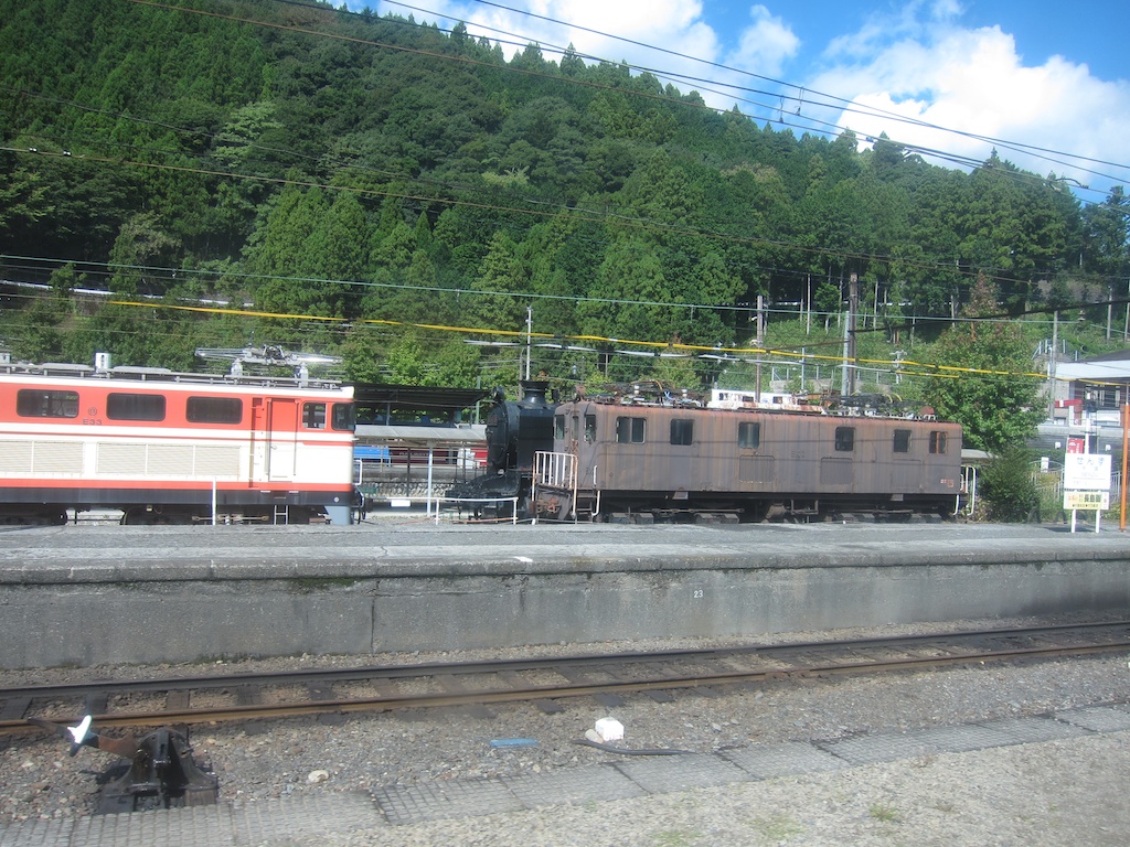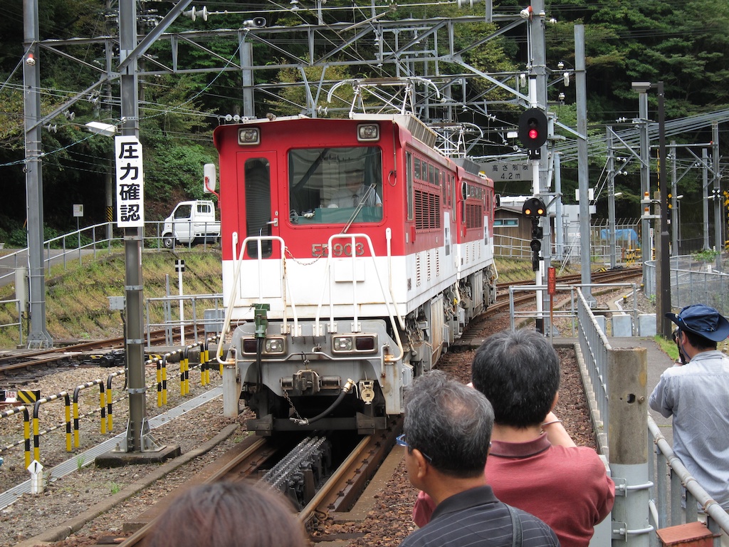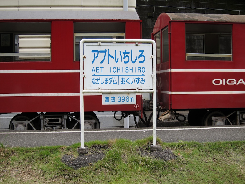 アプトいちしろ駅でアプト式機関車を取り付け。隣の長島ダム駅までは,日本で唯一のラック式鉄道区間になります。