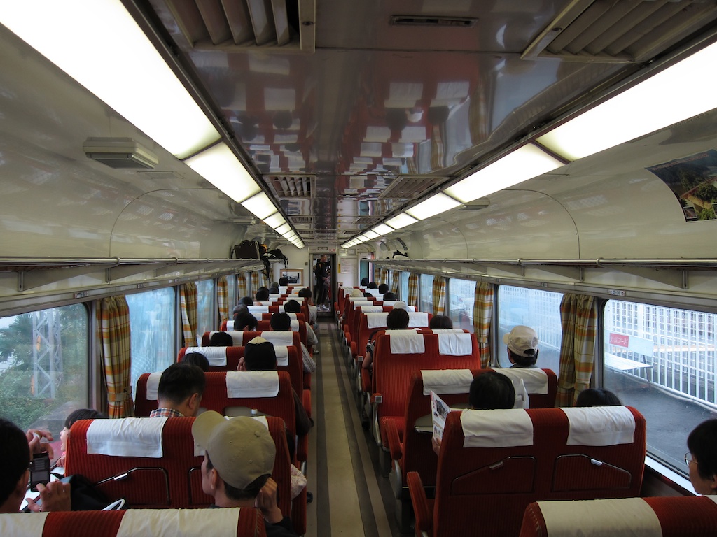 元特急列車だけあって,重厚な雰囲気。リクライニングはできないものの,小さなテーブル付きです。シートピッチが少々狭いのはご愛敬かな。