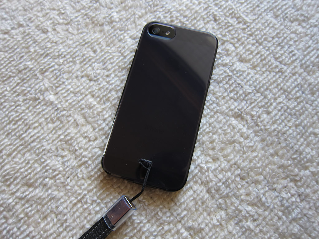 iPhone 4/4Sでは堅めのケースを使っていたけど,気分を変えるため今回はTPU素材の多少弾力性のあるもの(baw&g iPhone5 ソフトケース TPU)を選んでみました。滑りにくく,また背面のAppleロゴもわずかに透けてみえるのが気に入っています(ストラップ穴があるのも○)。