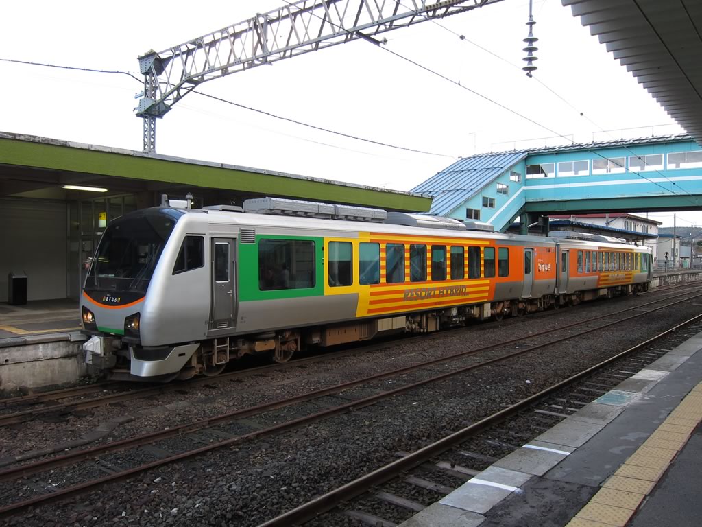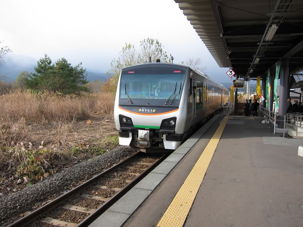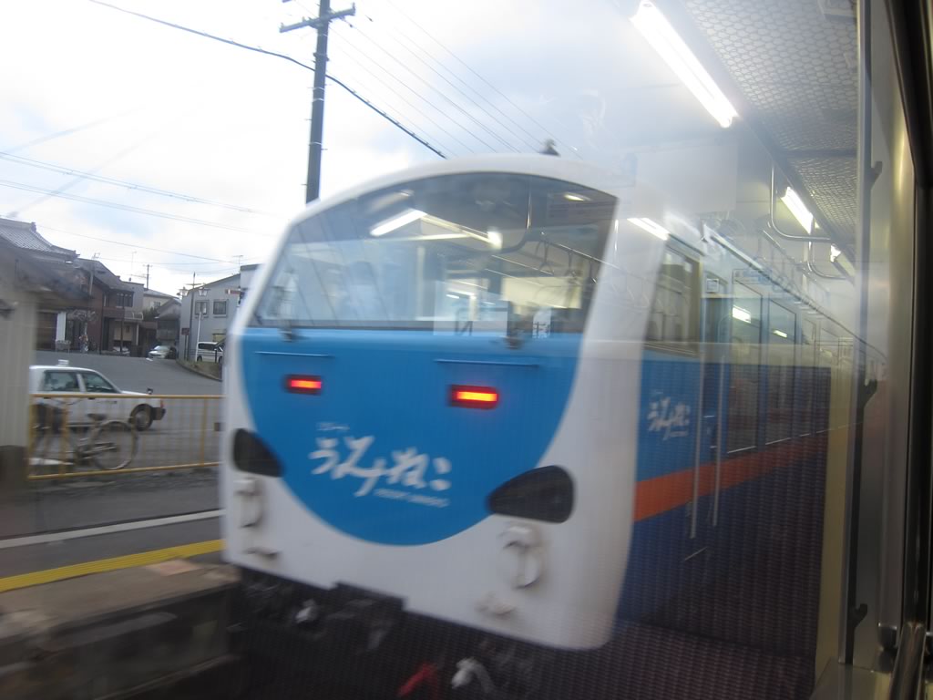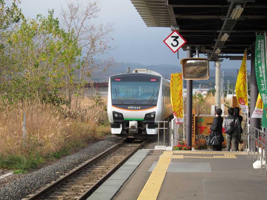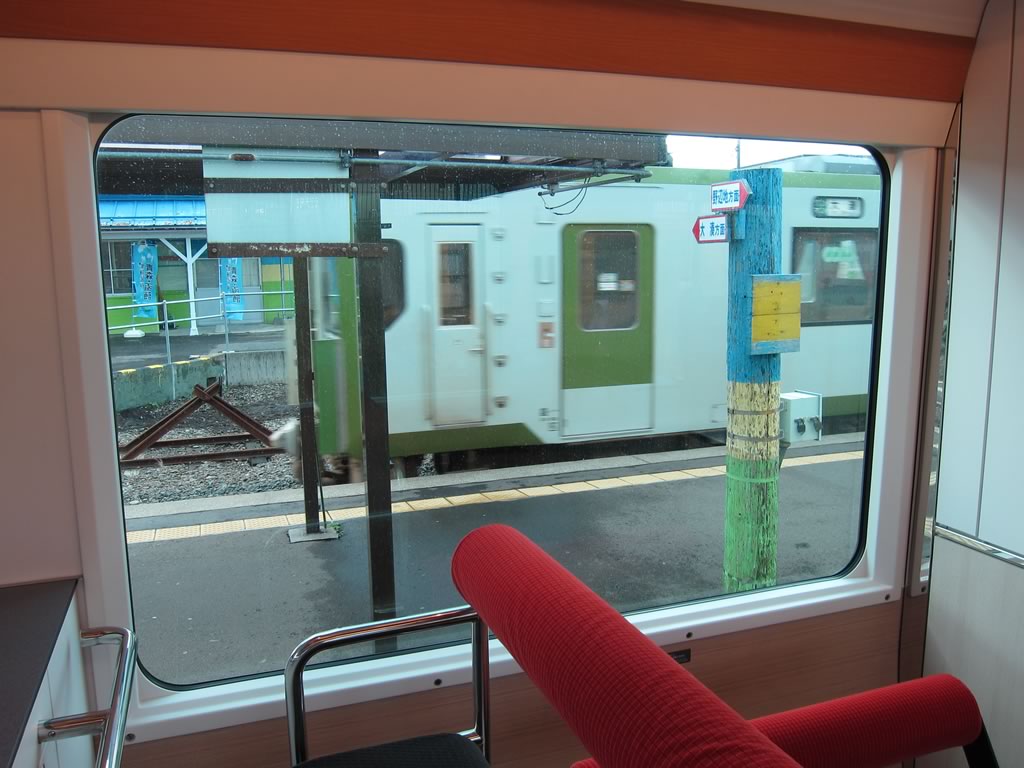 階上(はしかみ)駅で,リゾートうみねこ号と行き違い。