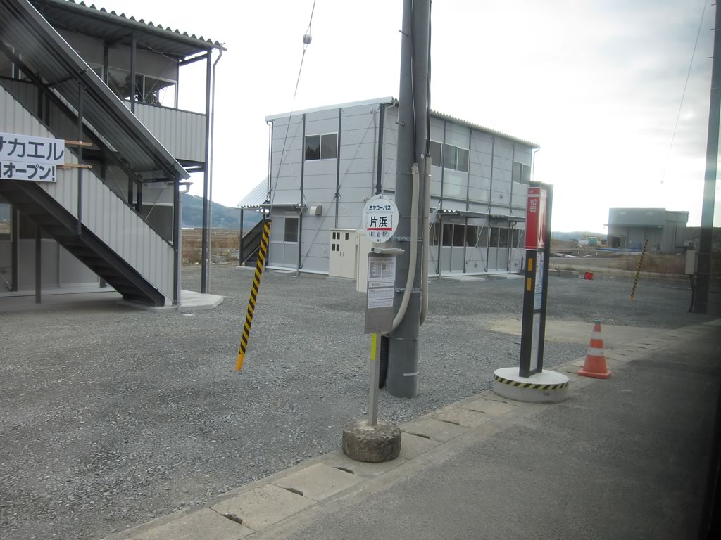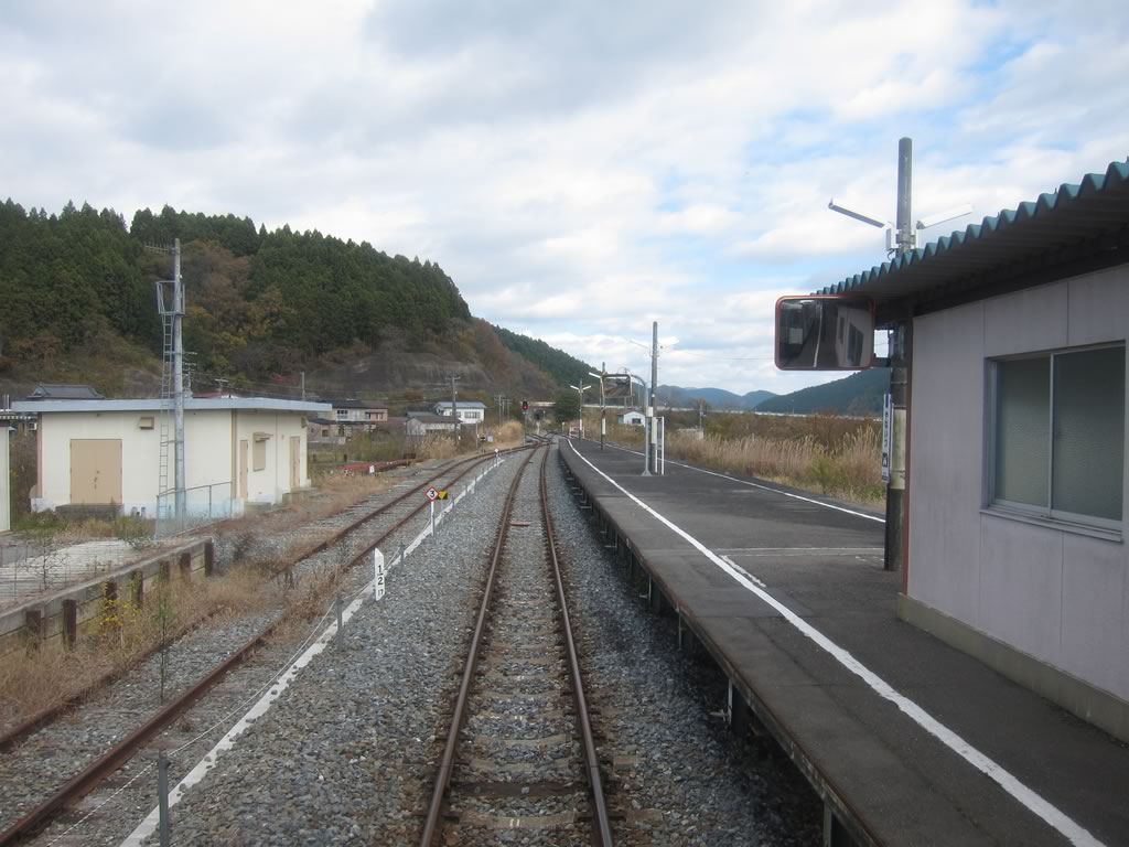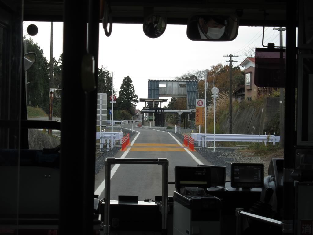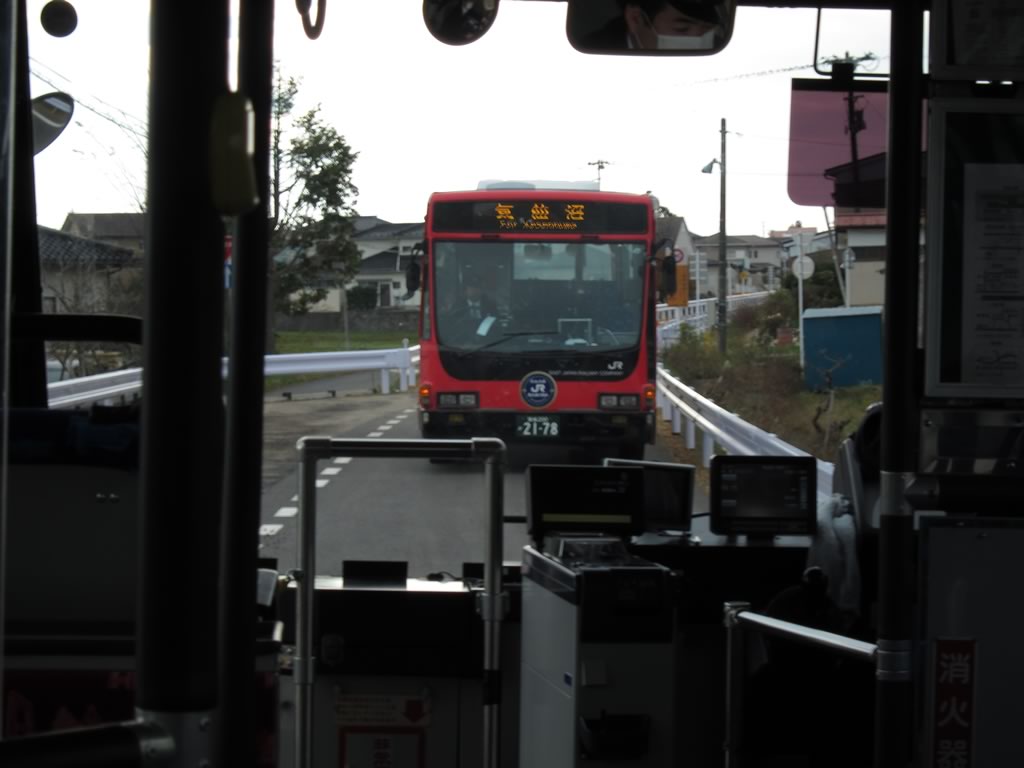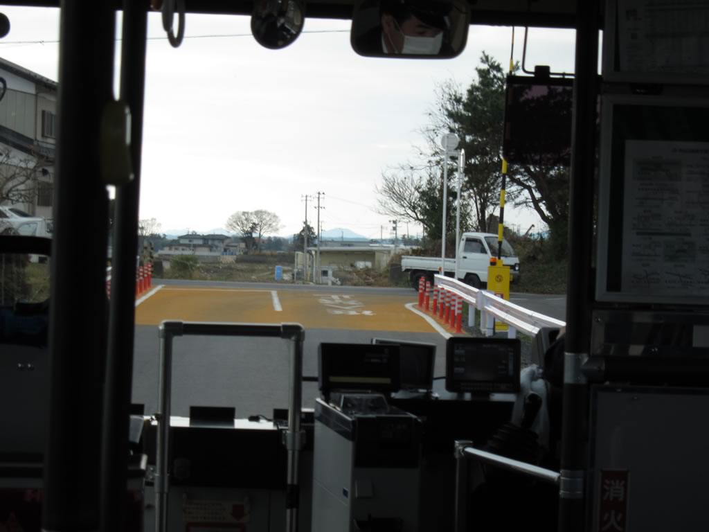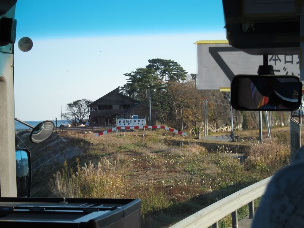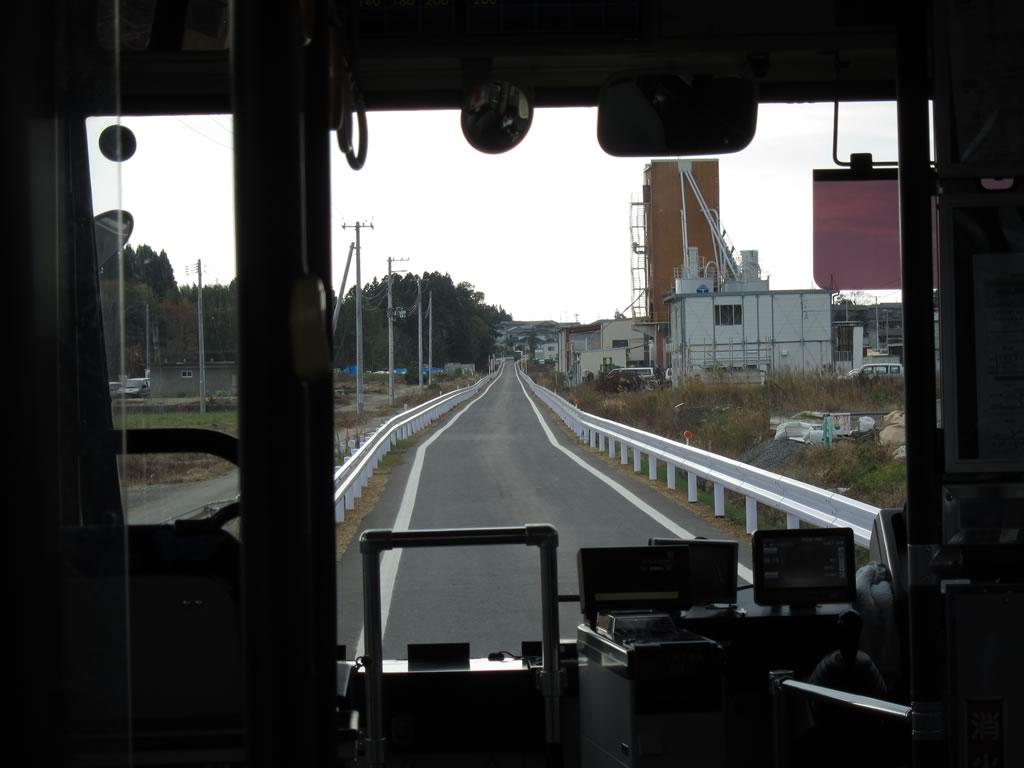 途中で線路が切れているのが分かります。代行バスが線路のあった場所を走るBRT(Bus Rapid Transit)が暫定整備されており,列車と同様,気仙沼方面のバスと途中で行き違いをします。