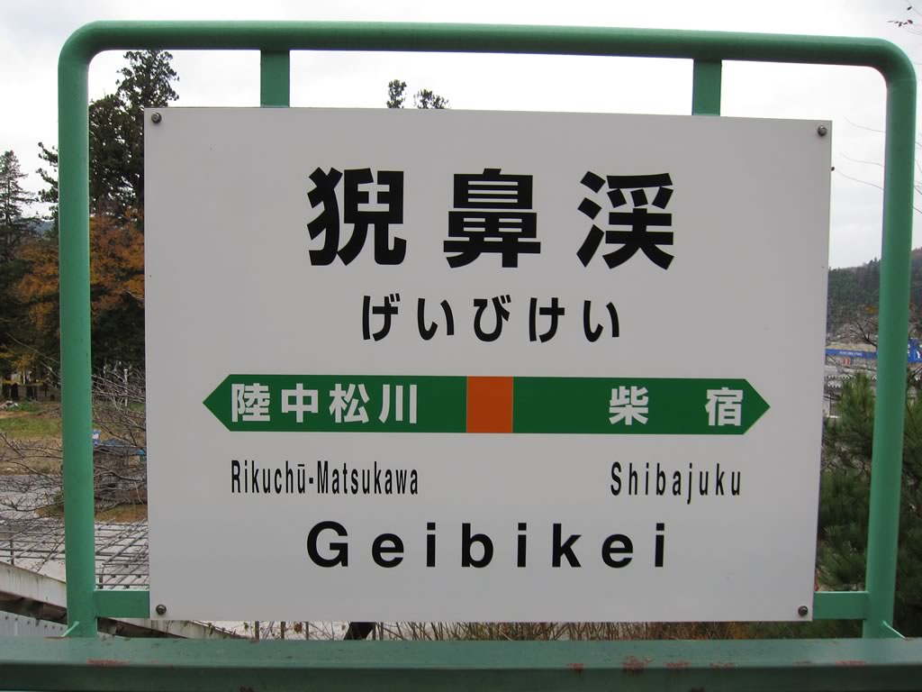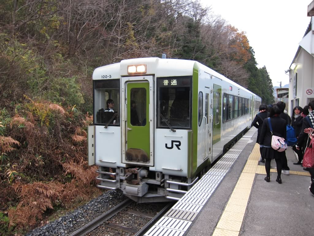 早朝の猊鼻渓駅。高校生の通学客が数人列車を待っていました。