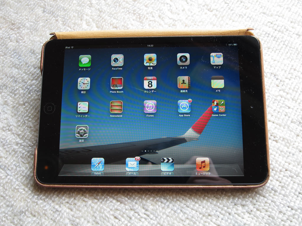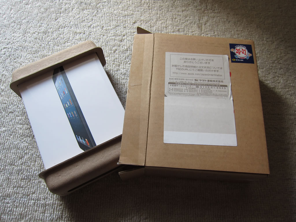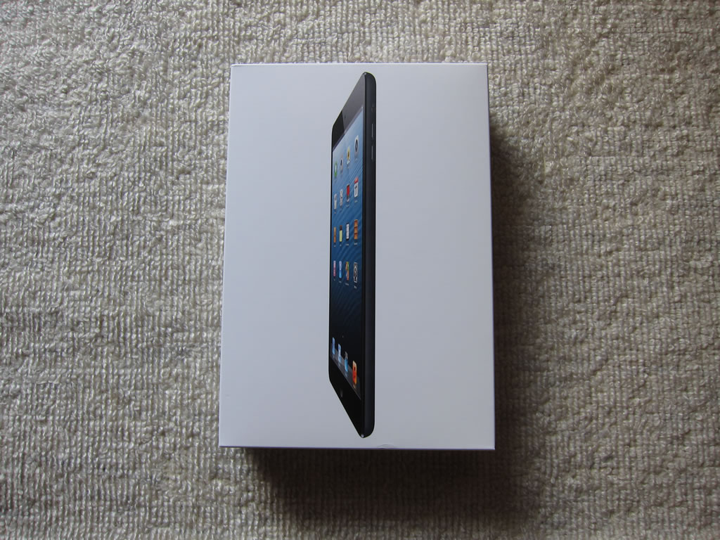 Apple製セットトップボックスことApple TVの第2世代を自宅で,初代を実家で使っているのだけど,ハードディスク内蔵型の初代Apple TVの調子がわるくなり,「おさがり」(=第2世代)を実家送りにするため,最新の第3世代Apple TVを某家電量販店の初売りで買ってしまいました。その帰りにApple Storeに立ち寄ってiPad miniを触ってみたところ,一瞬で「ホレ」てしまい,店頭在庫が無かったので家に帰ってからオンラインのApple Storeで黒のiPad mini 64GBモデル(Wi-Fi版)を注文してしまった次第デス。出荷まで2週間と書かれていたのに,翌々日には到着する爆速っぷりでしたね。おかけで別注のケースよりも先に開封することになりました。
