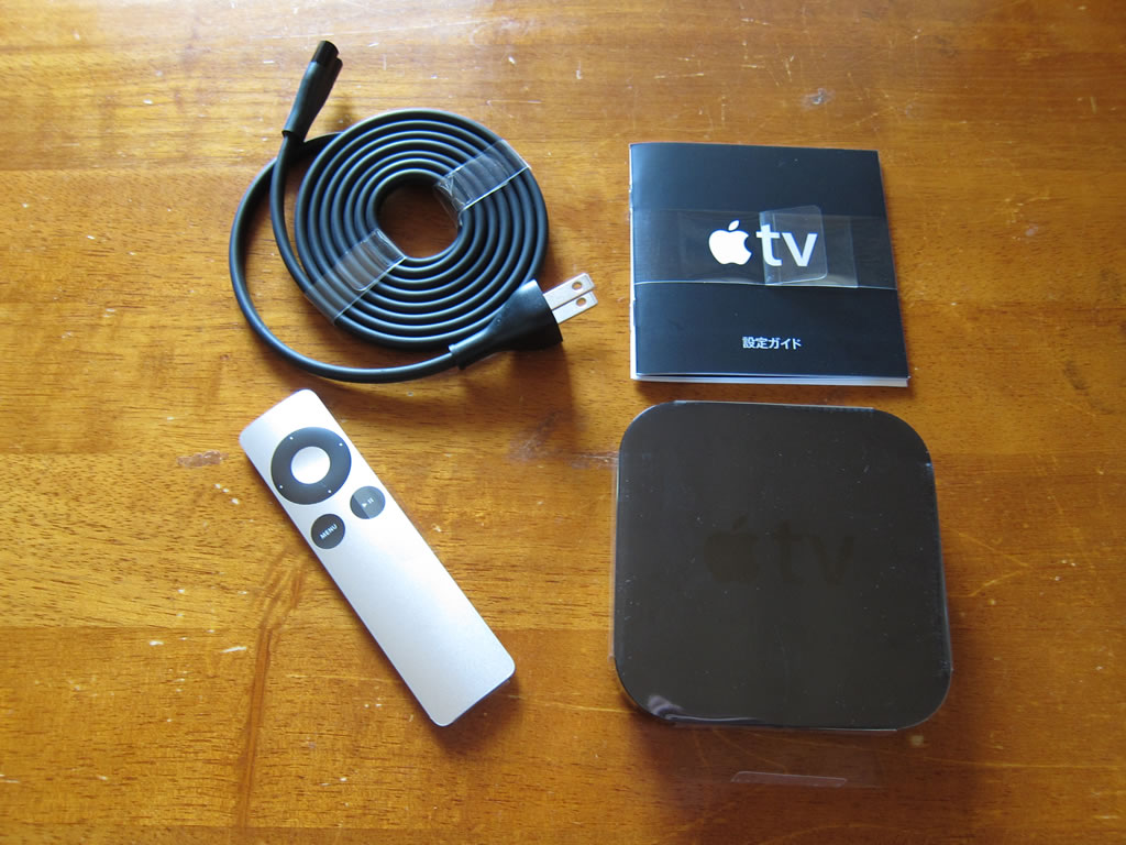 同梱物も新旧全く一緒でした。アルミ製のApple Remoteもペアリング済の状態で入っています。初代はハードディスク内蔵型で形状もまったく違ったけど,第2・3世代は筐体は同一で,1080pのフルHD動画を再生できるかどうかの差しかないのですね(たぶん)。
